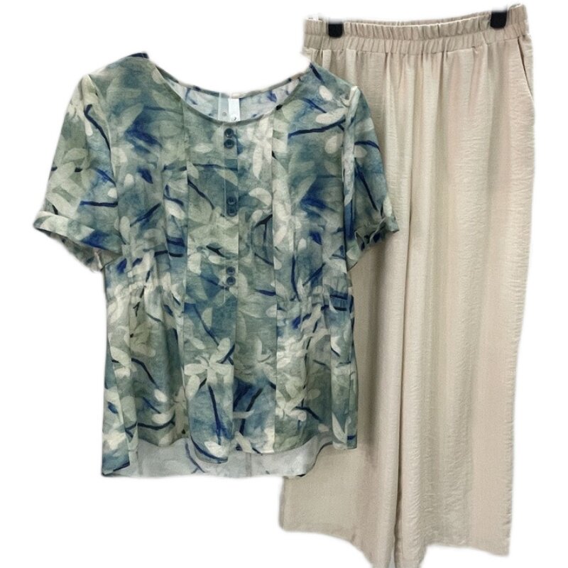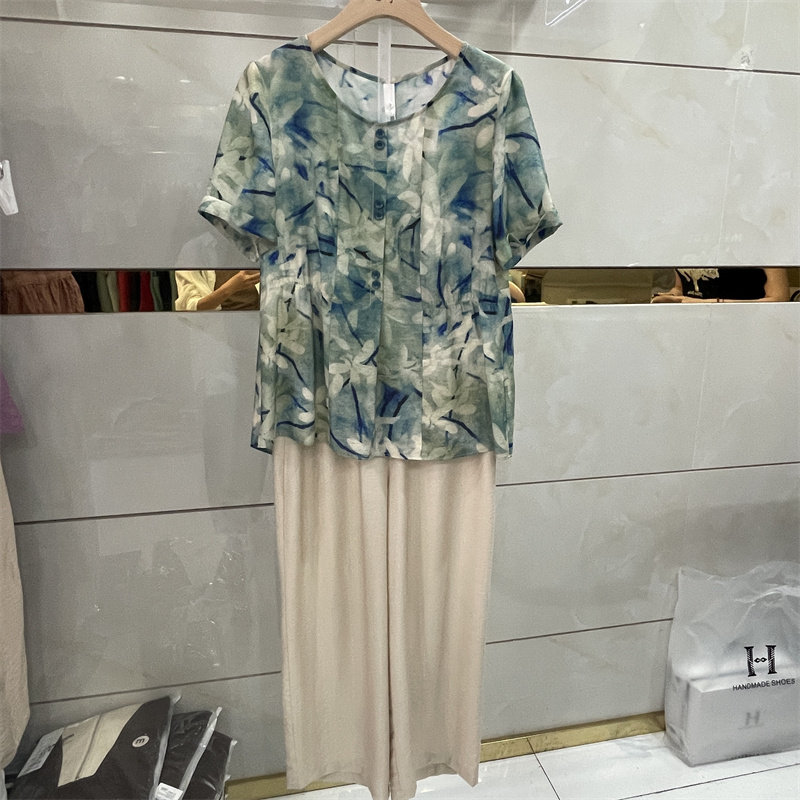 淘宝珑心物语女装店,正品圆领夏季新款时尚花色两件套2023休闲印花妈妈棉麻套装套裤