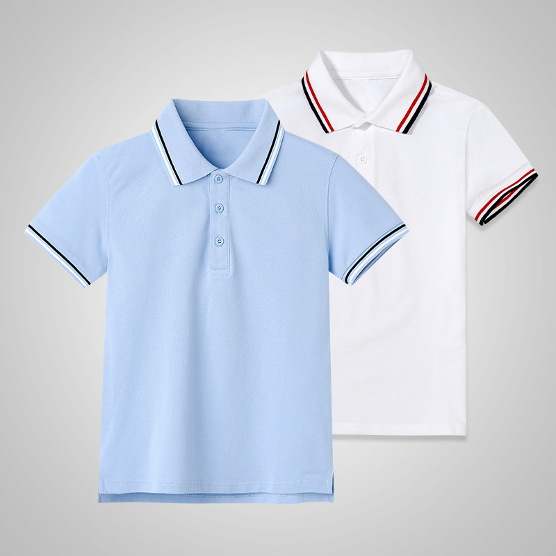 男童polo衫短袖夏季大儿童浅蓝色白色纯棉T恤女童小学生校服班服
