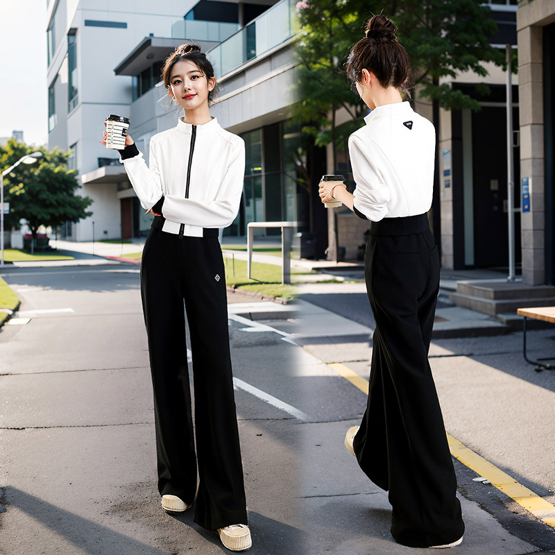 现货新款撞色拉链收腰轻奢气质减龄洋气立领开衫阔腿裤两件套
