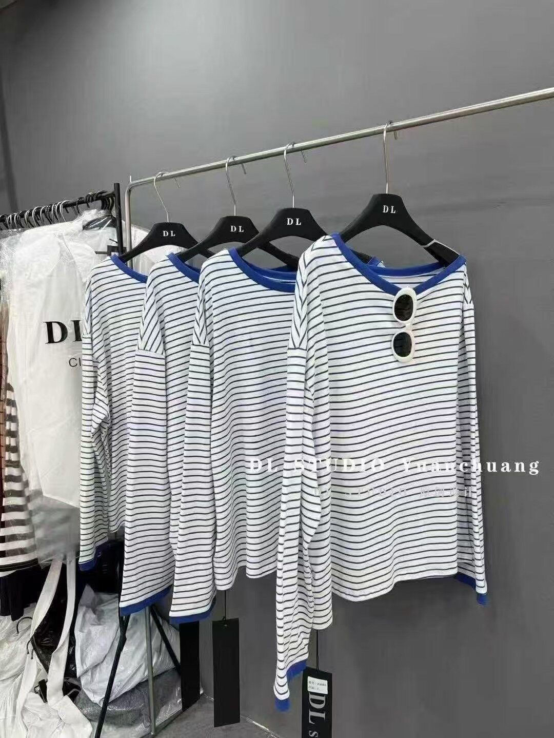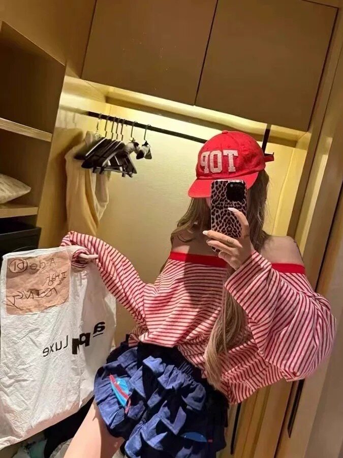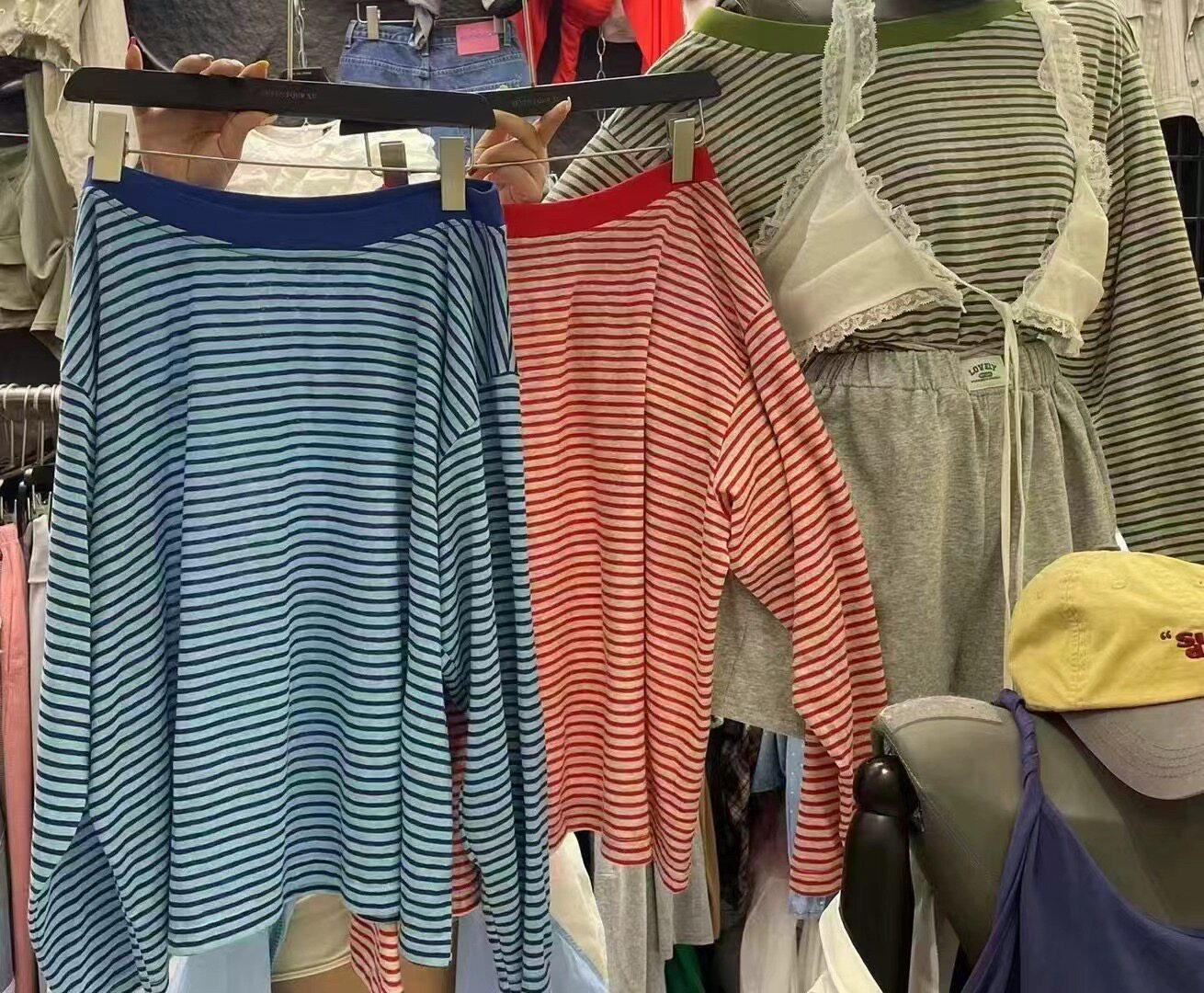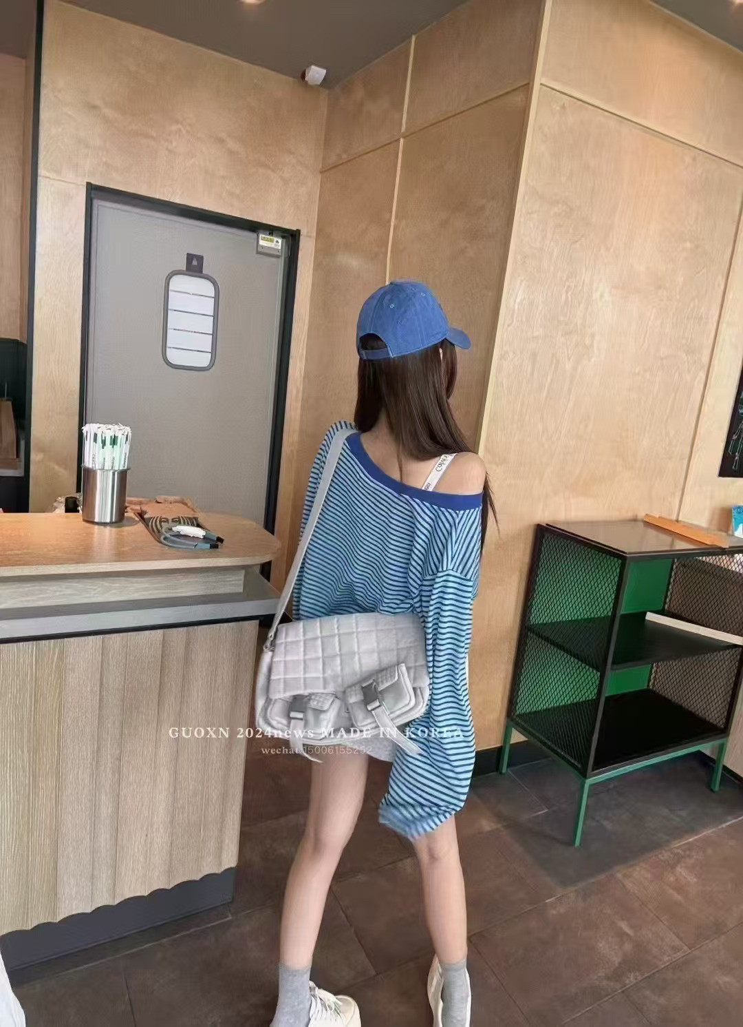 淘宝KBB韩国女装,韩国东大门新款韩系ins风宽松休闲漏肩一字肩条纹防晒长袖T恤
