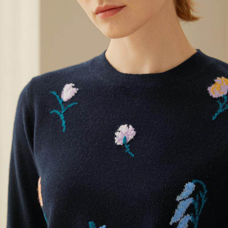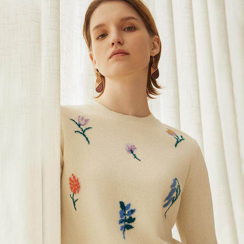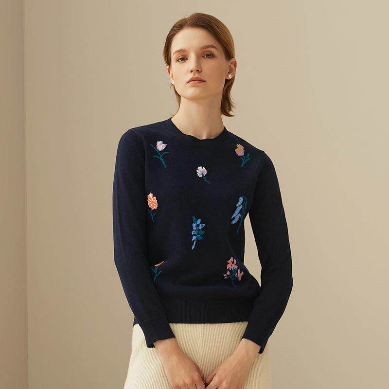 鹿王100%纯山羊绒衫女士圆领打底提花保暖针织毛衣套衫24秋冬新款