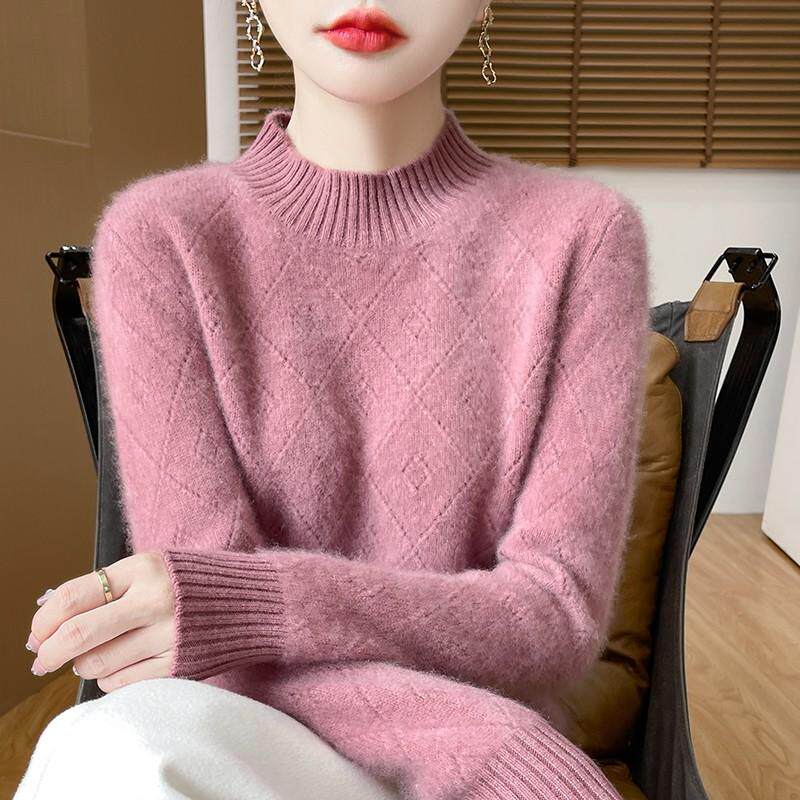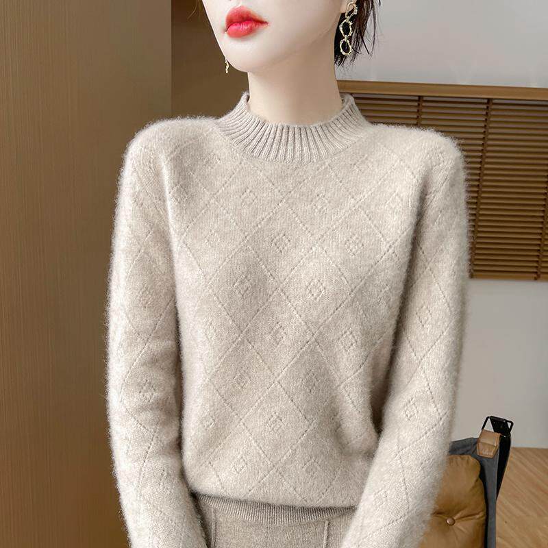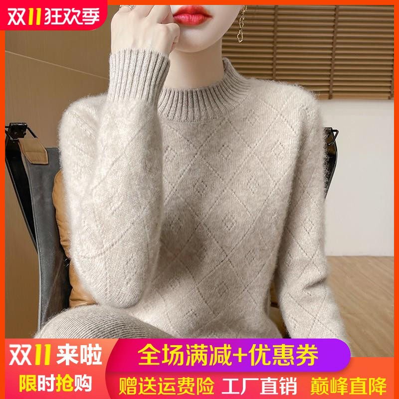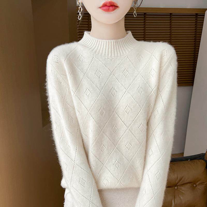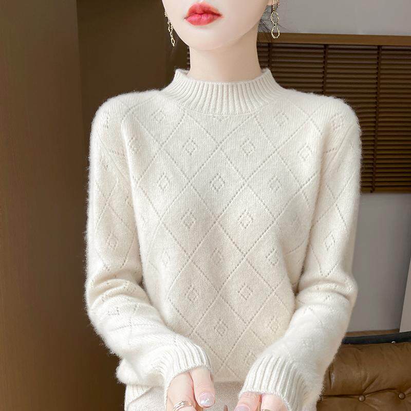 100%纯羊绒衫女半高领菱形镂空钩花针织毛衣百搭宽松羊毛衫打底衫