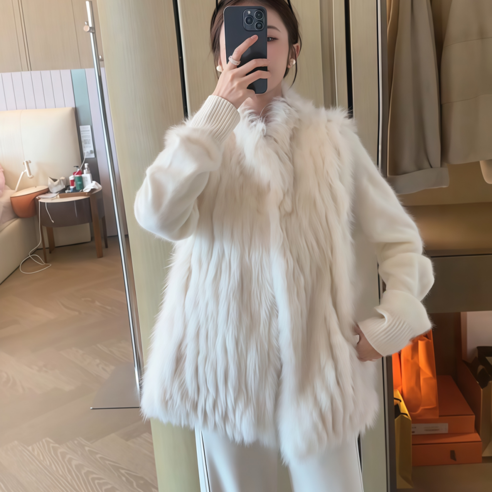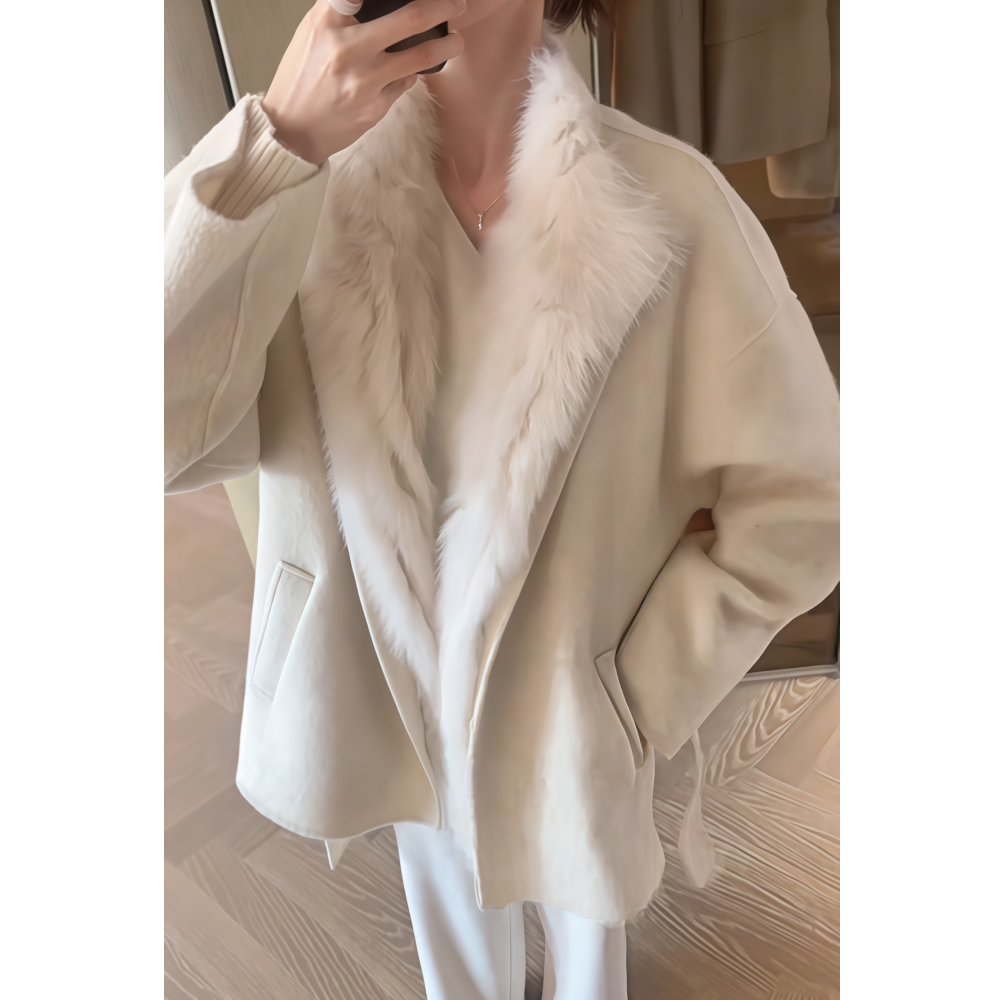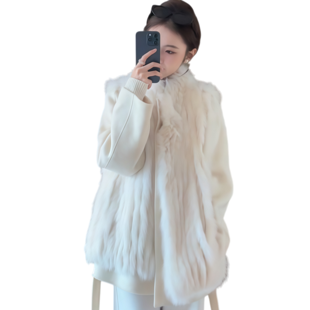 淘宝芒果自制 大女装店,2025冬季新款韩系洋气休闲小个子白色毛绒领毛呢外套加毛绒马甲女