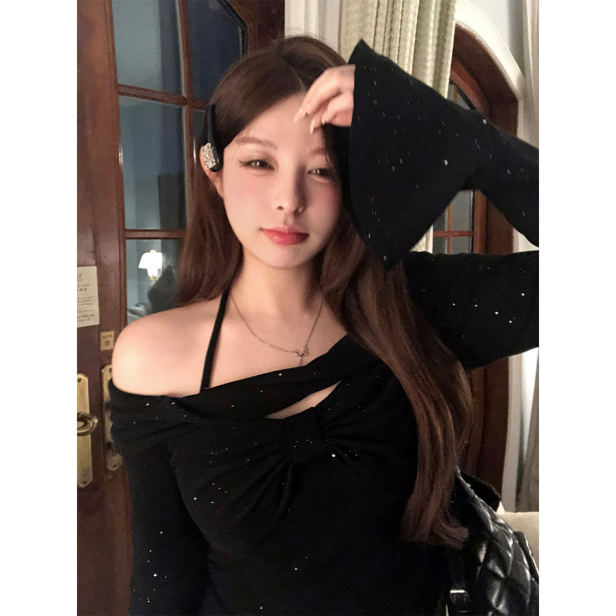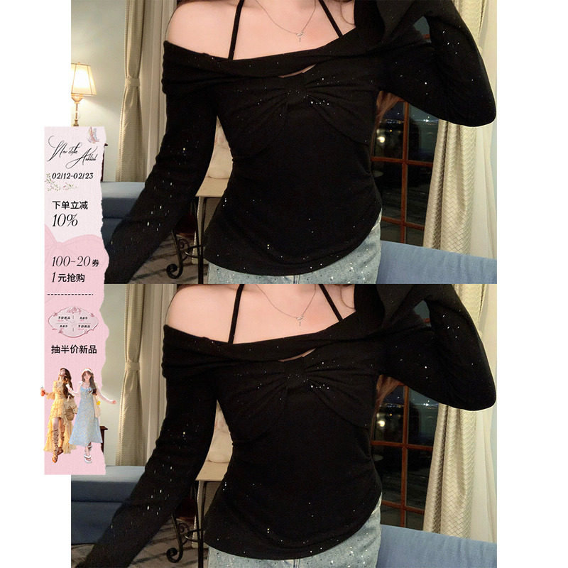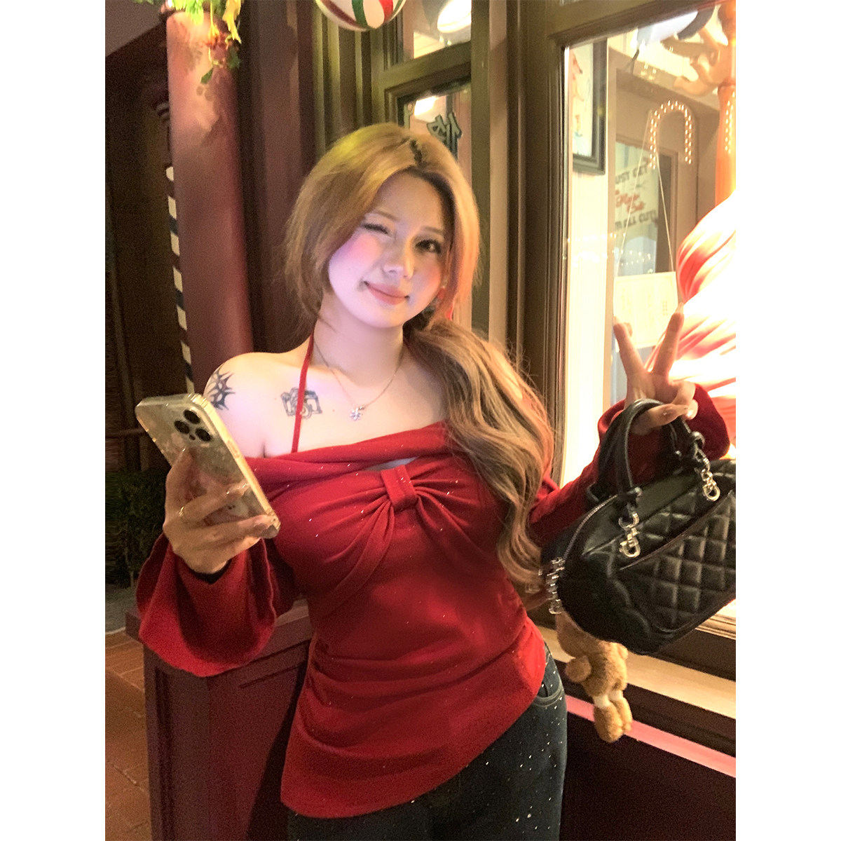 淘宝安妮不火,安妮不火 一字肩蝴蝶结领烫闪高弹磨毛T恤女微胖大码收腰挂脖上衣