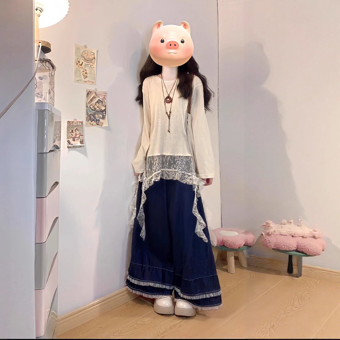 实拍细节】胖mm秋季大码女装牛仔套装百搭时尚遮肚显瘦森系休闲风