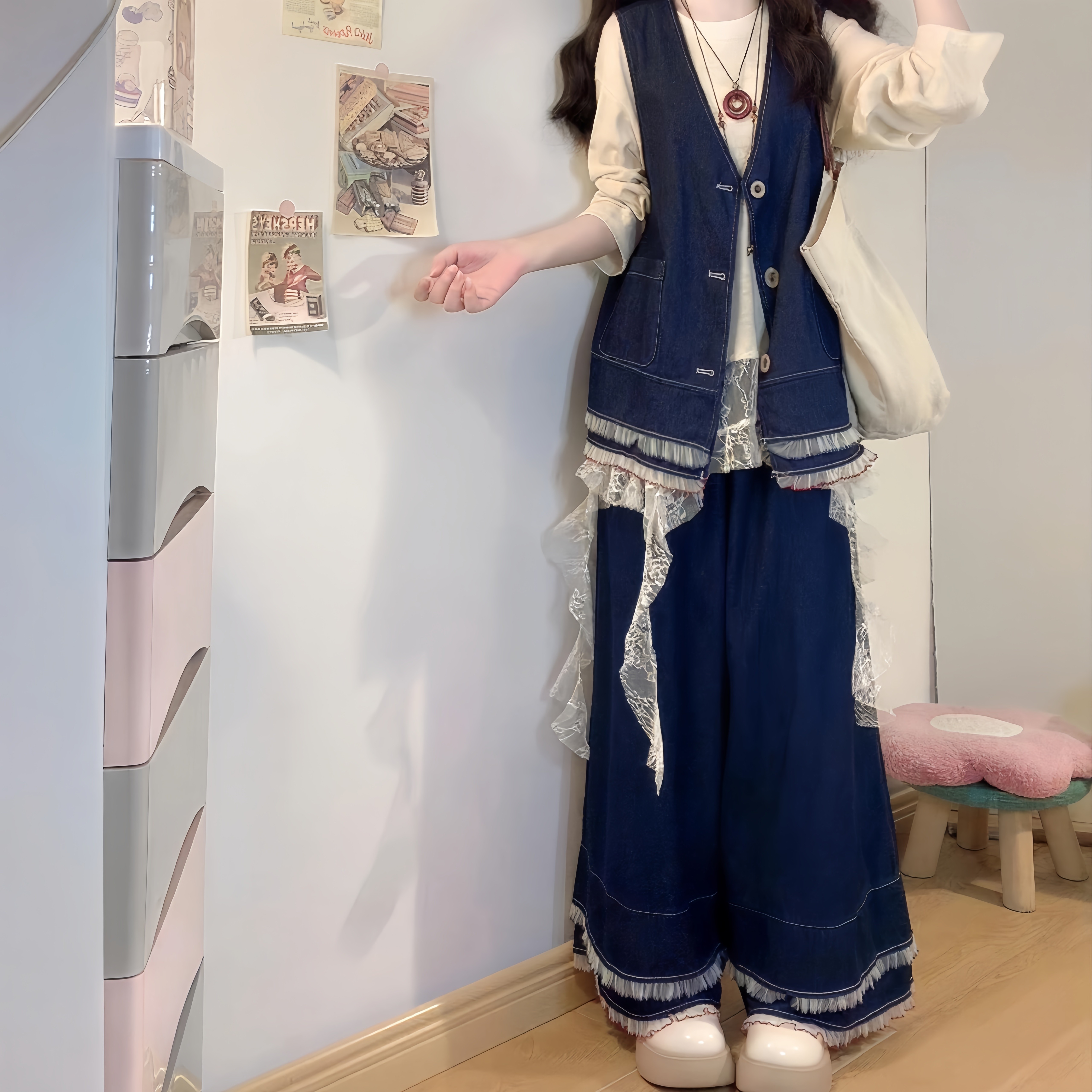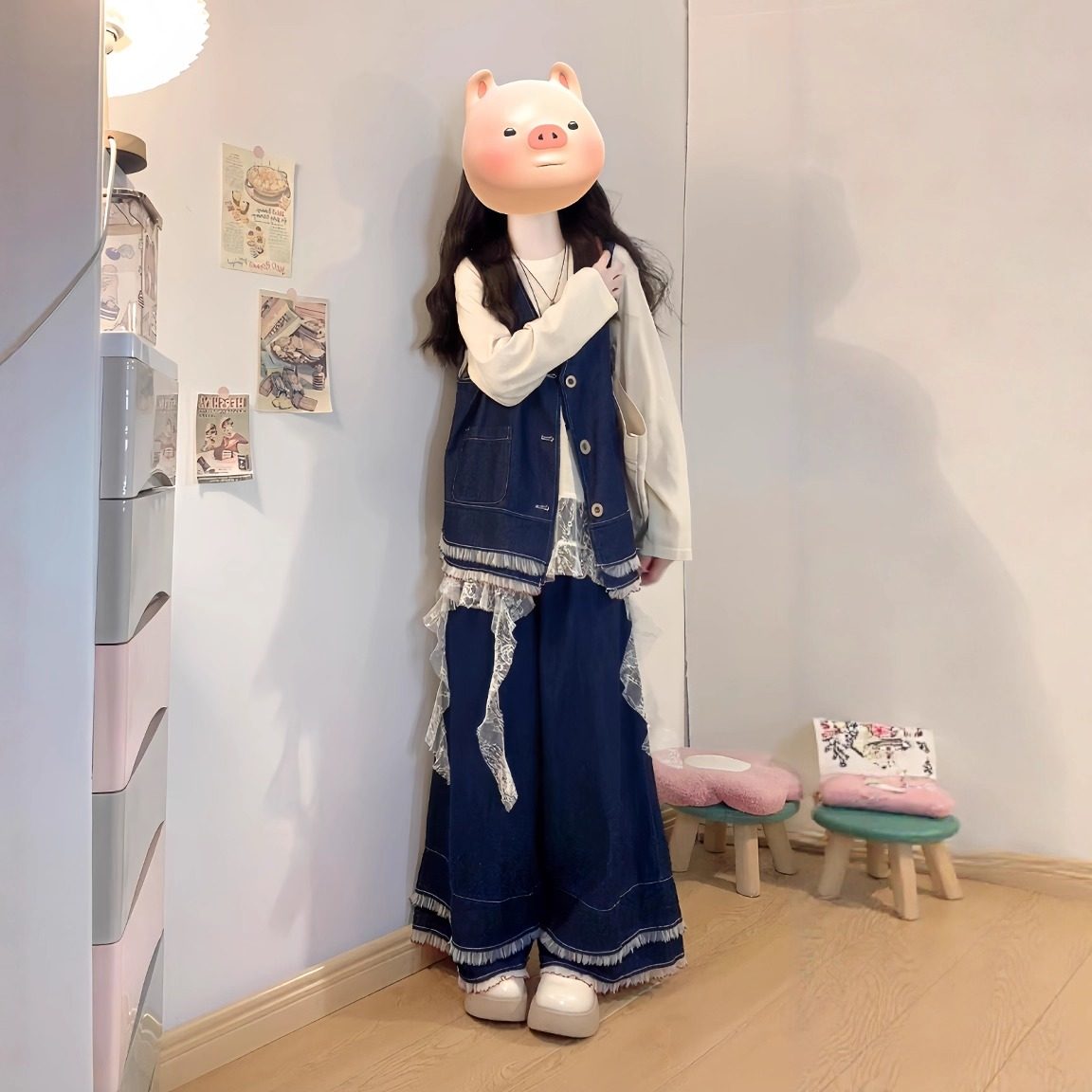 大码套装蕾丝拼接内搭开衫阔腿裤