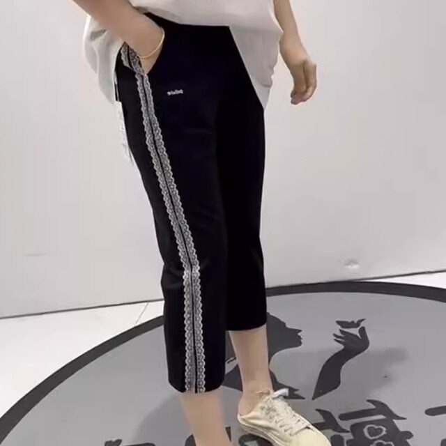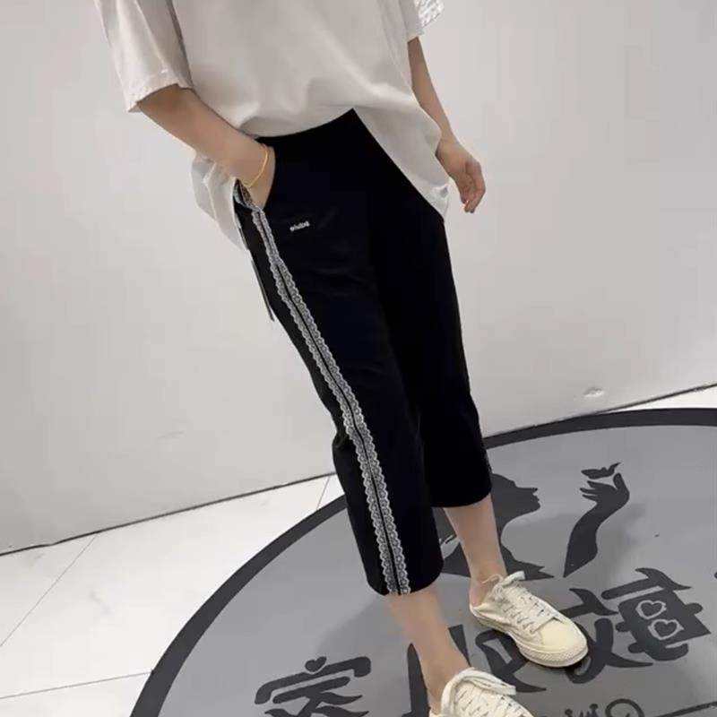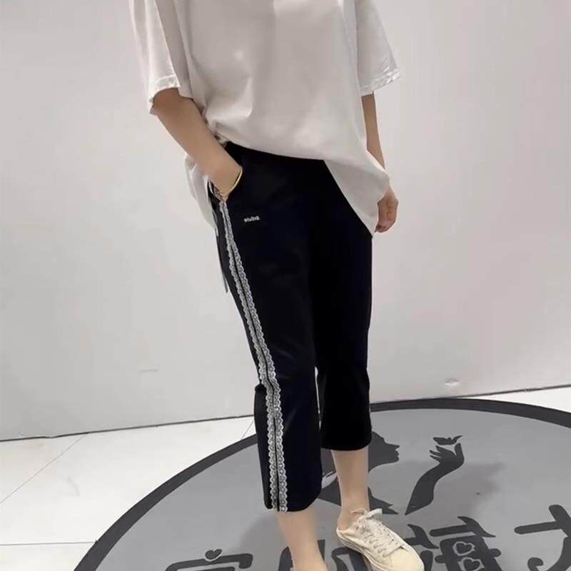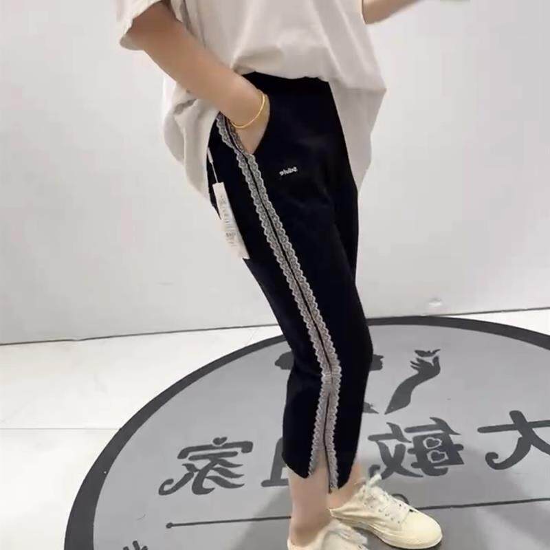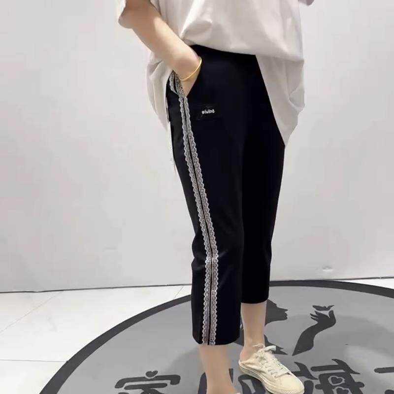 淘宝雪伊人大码女装,女权贵族2025夏季新款侧条纹松紧腰弹力拼接黑裤脚开叉八分裤3660