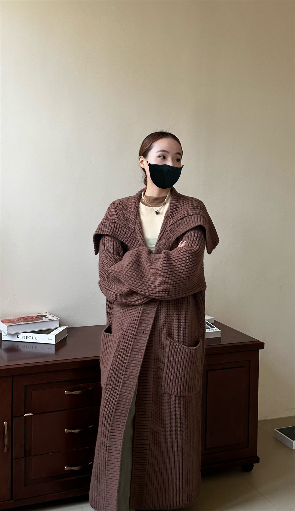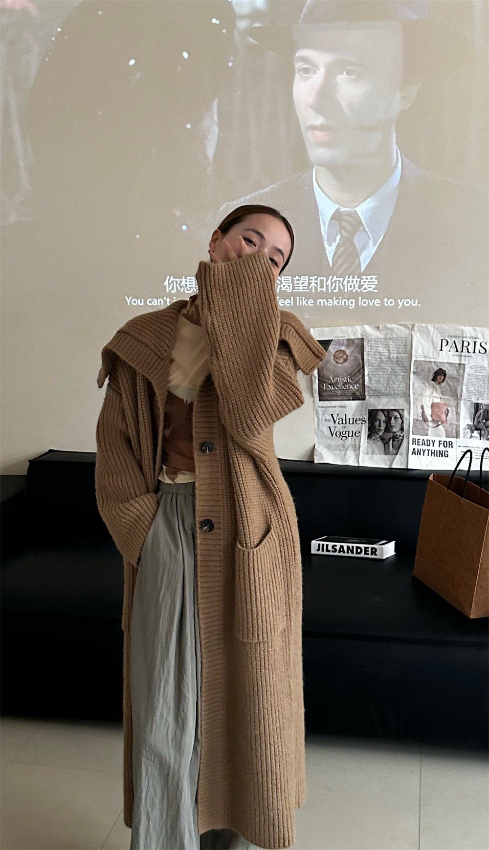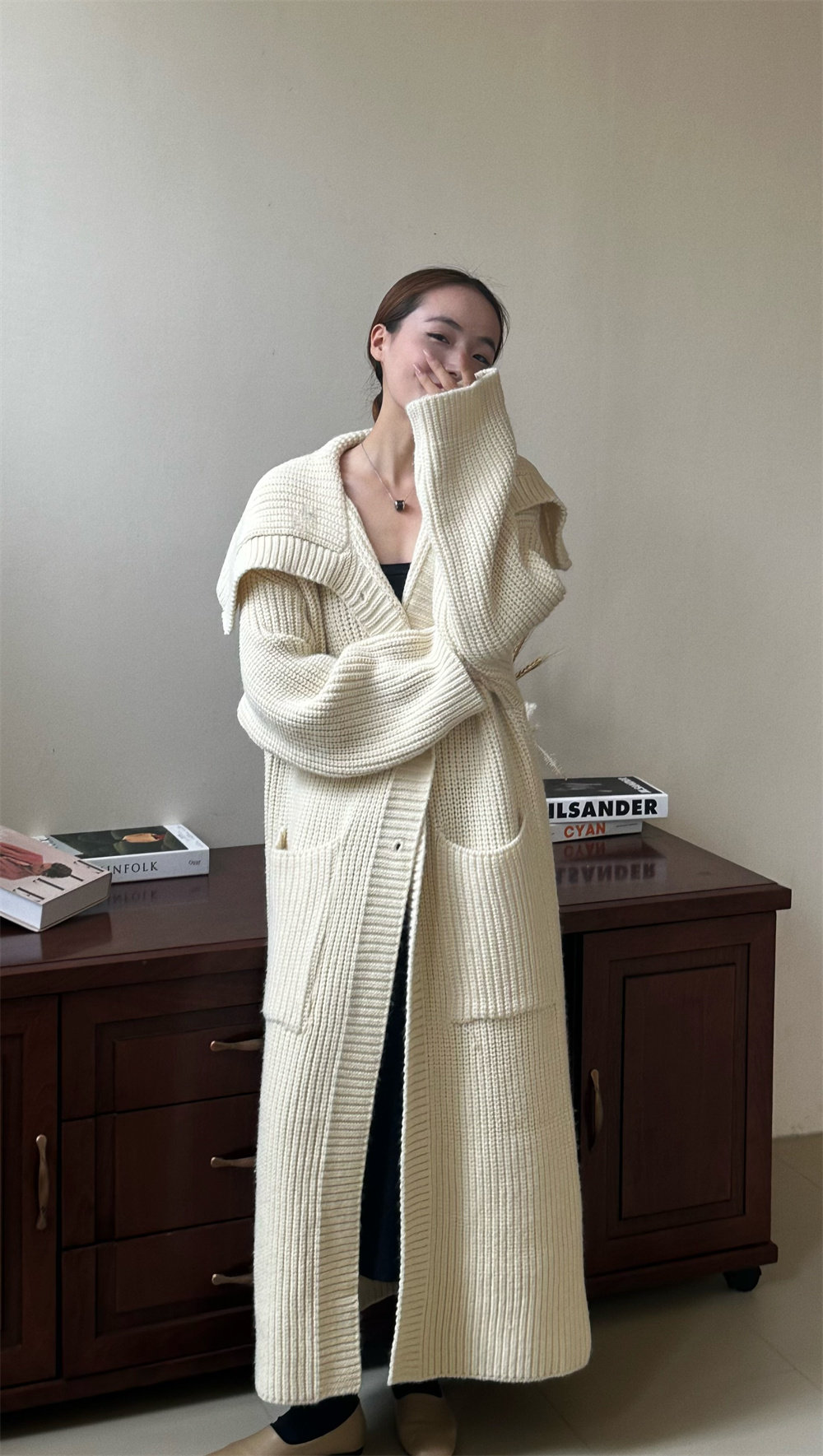 淘宝Fj静静葛工厂店,原版超长款翻领毛衣外套女秋冬慵懒风宽松气质加厚中长款针织开衫