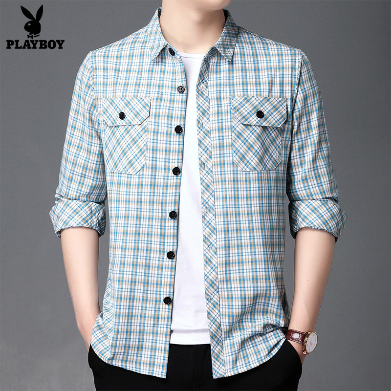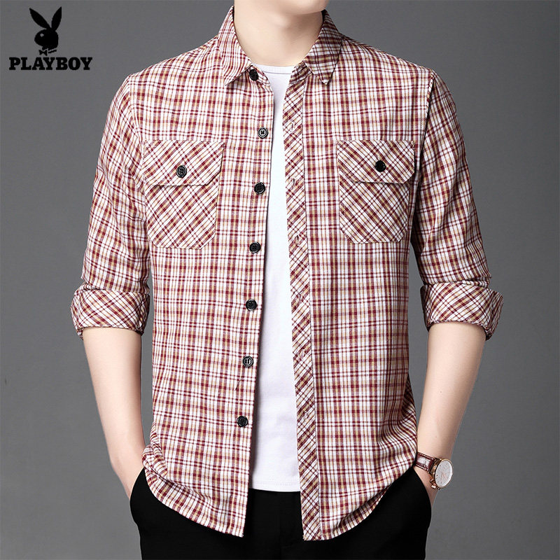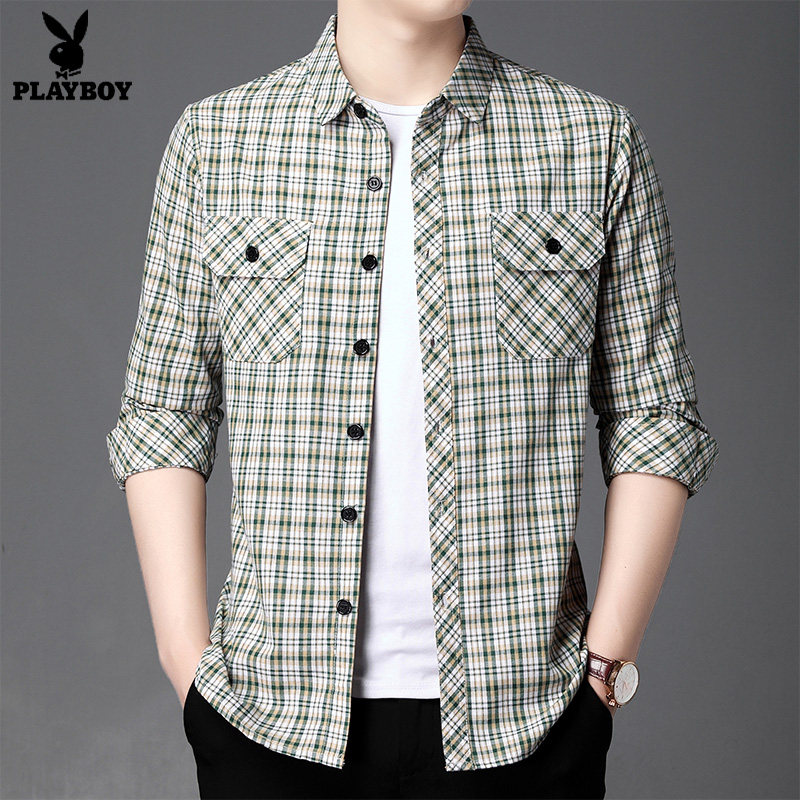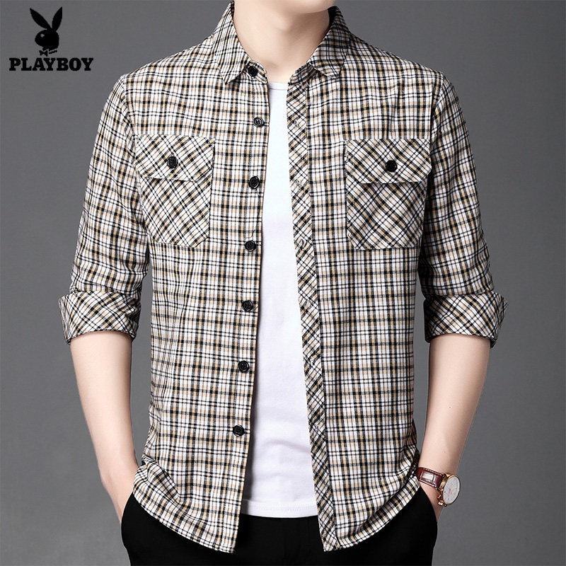 淘宝品牌潮流男装1号店,花花公子长袖衬衫男秋季新款格子上衣休闲工装格子外套男士衬衣潮