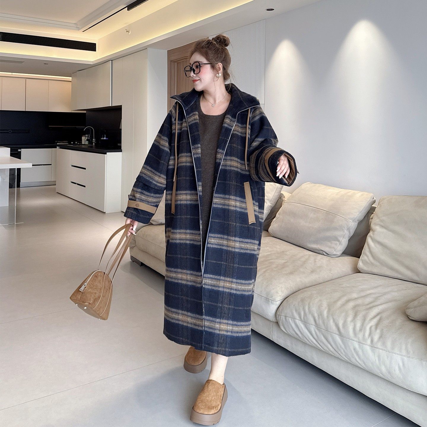 淘宝媛子家定制大码女装,媛子家大码秋冬季宽松百搭格子外套胖mm毛呢大衣女
