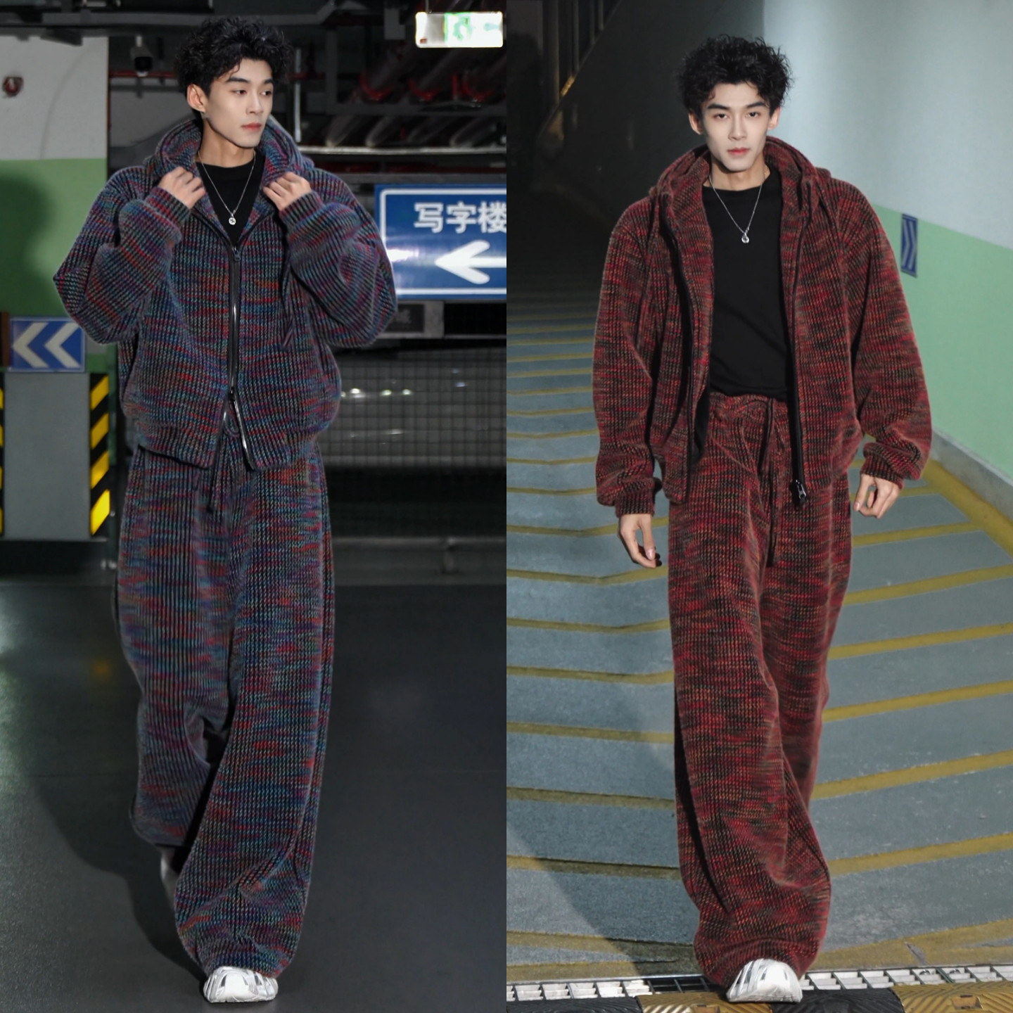 淘宝鹿梵希男装,冬季美式复古撞色设计感套装男士