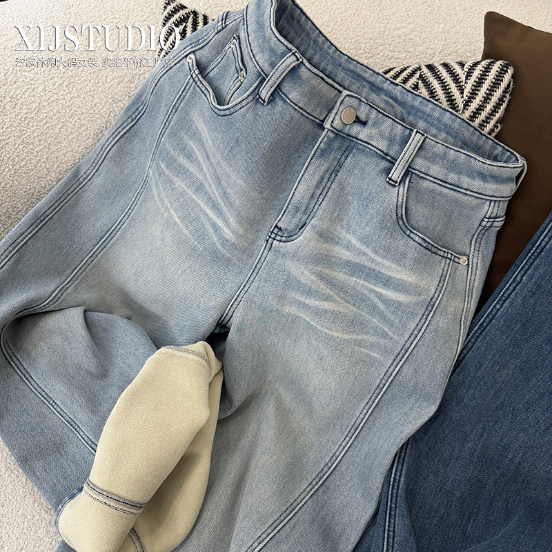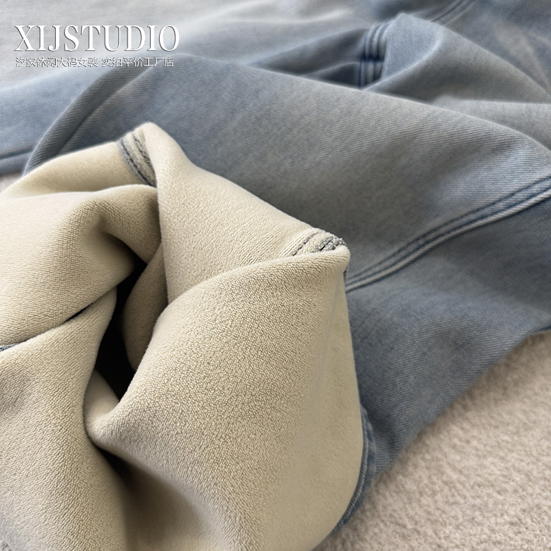 淘宝汐家休闲大码女装,汐家女裤 秋冬腔调拼接阔腿裤大码宽松休闲高腰加绒高品质牛仔裤