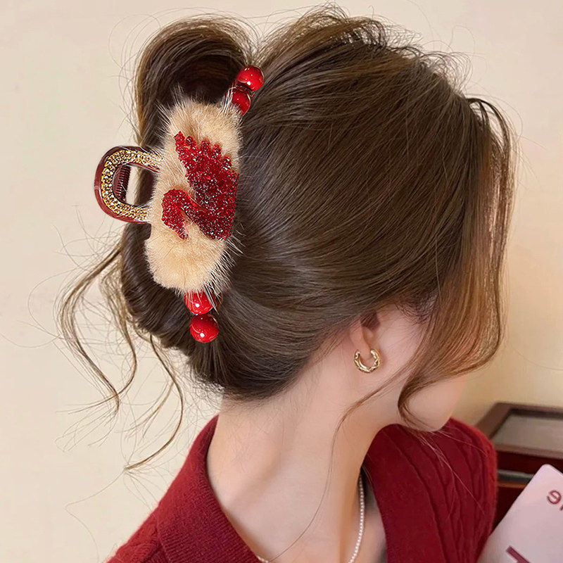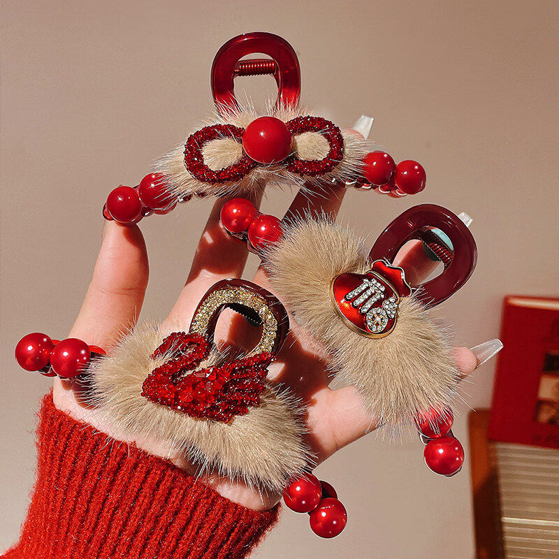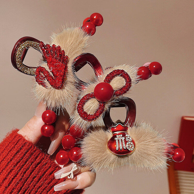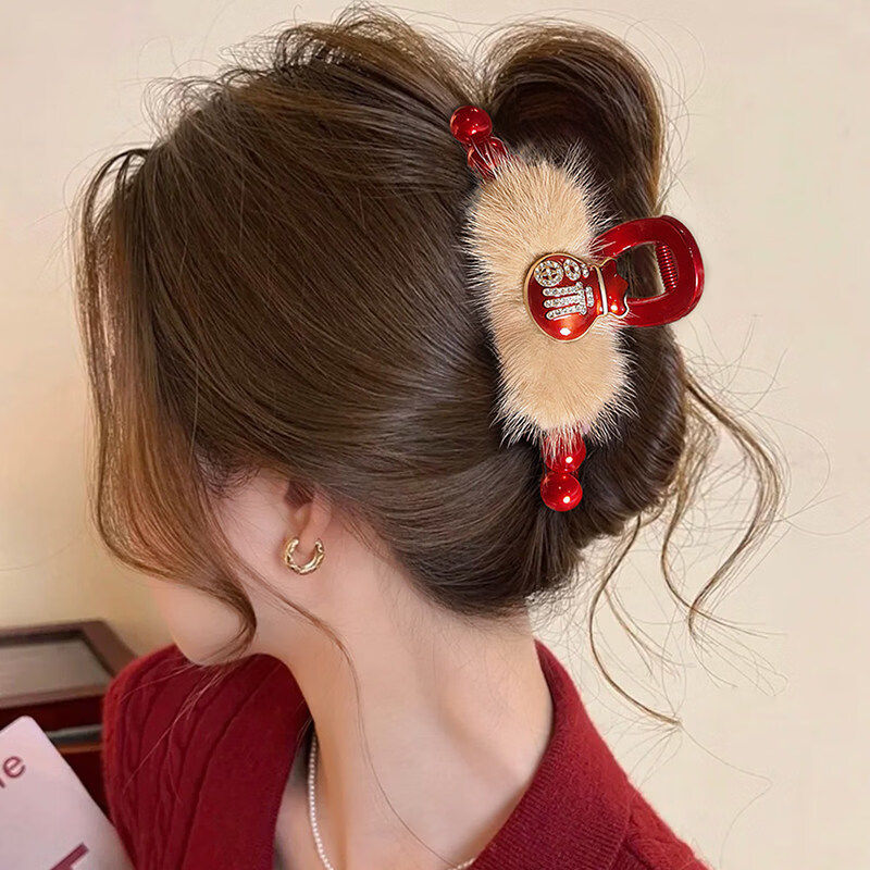 淘宝一 一日用百货店,H新年红色美发造型抓夹女毛绒