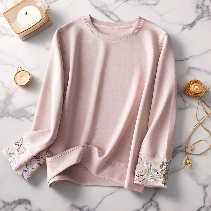 淘宝Slimart,新中式国风刺绣舒适德绒秋冬女上衣设计感长袖T恤打底衫大码300斤