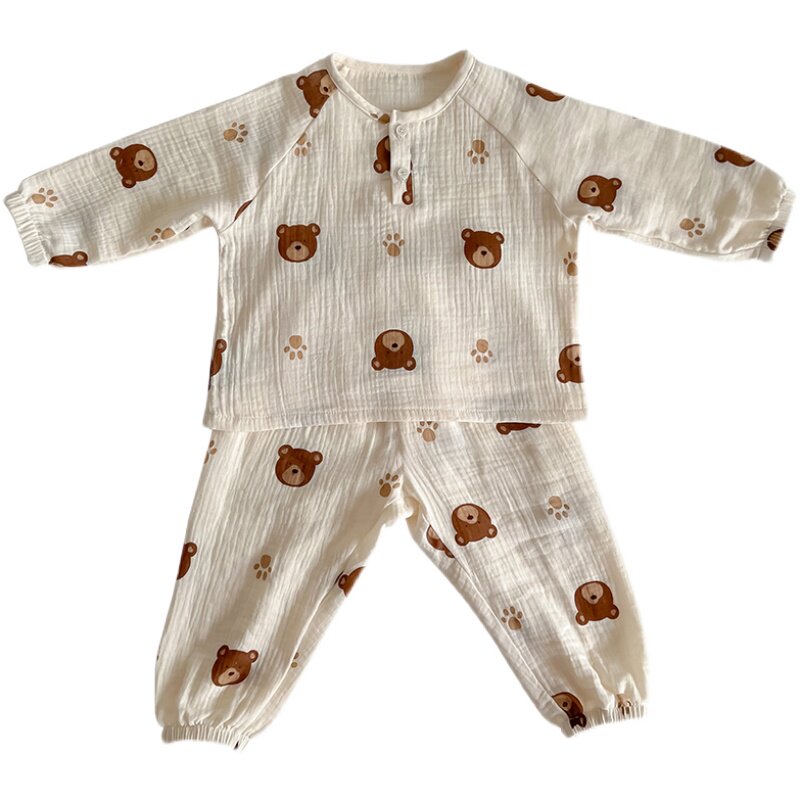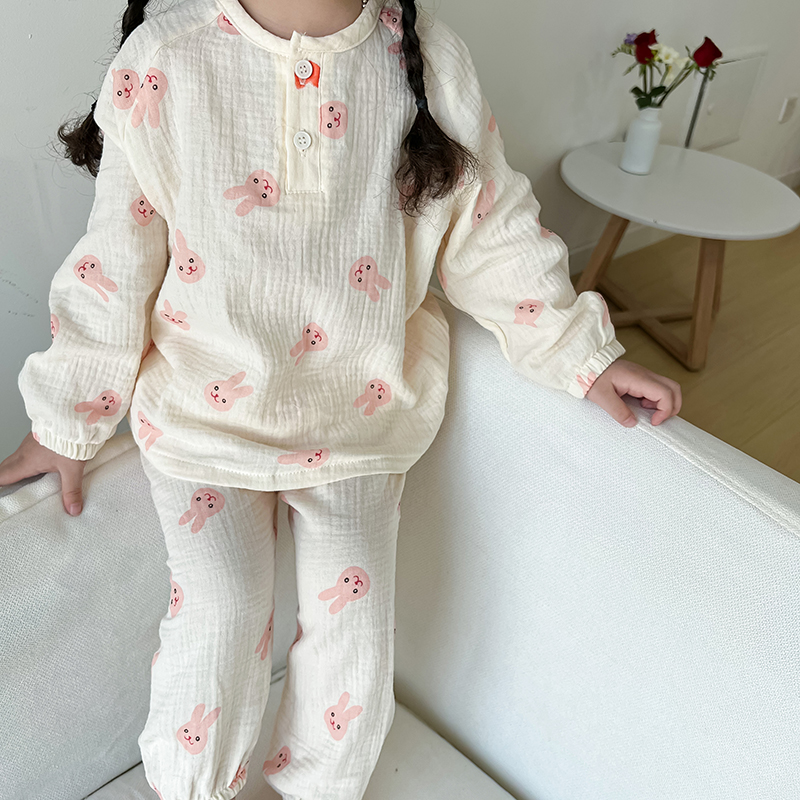 夏季亲子纱布家居服套装长袖薄款棉纱睡衣母女装男女童空调服四季