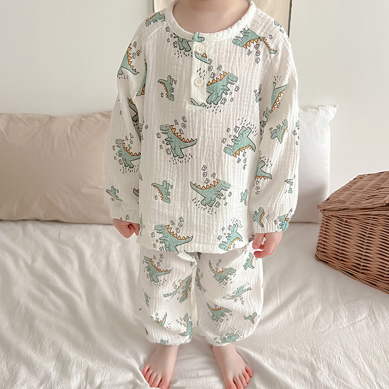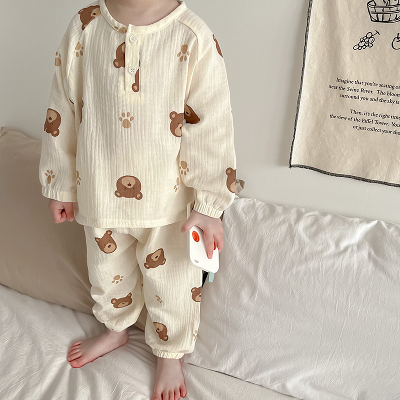 淘宝豆芽家 童品,夏季亲子纱布家居服套装长袖薄款棉纱睡衣母女装男女童空调服四季
