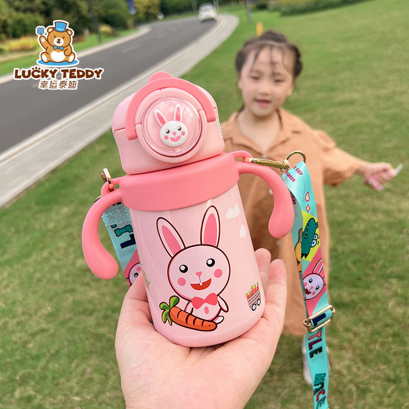 淘宝幸运泰迪水杯工厂,幸运泰迪双手柄有背带儿童保温杯