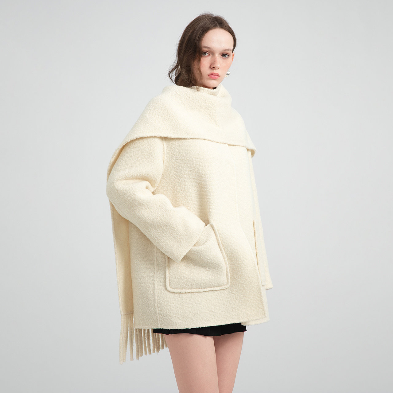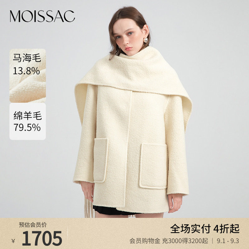 天猫moissac旗舰店,MOISSAC摩萨克2025秋新款休闲少女感流苏装饰围巾领口短款大衣女