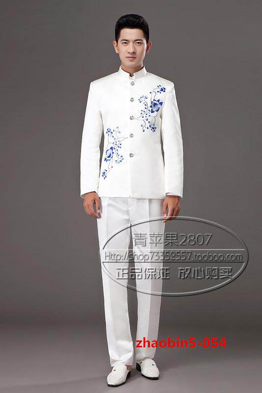 新款青花瓷立领民族中山装舞台表演大合唱男装套装主持司仪演出服