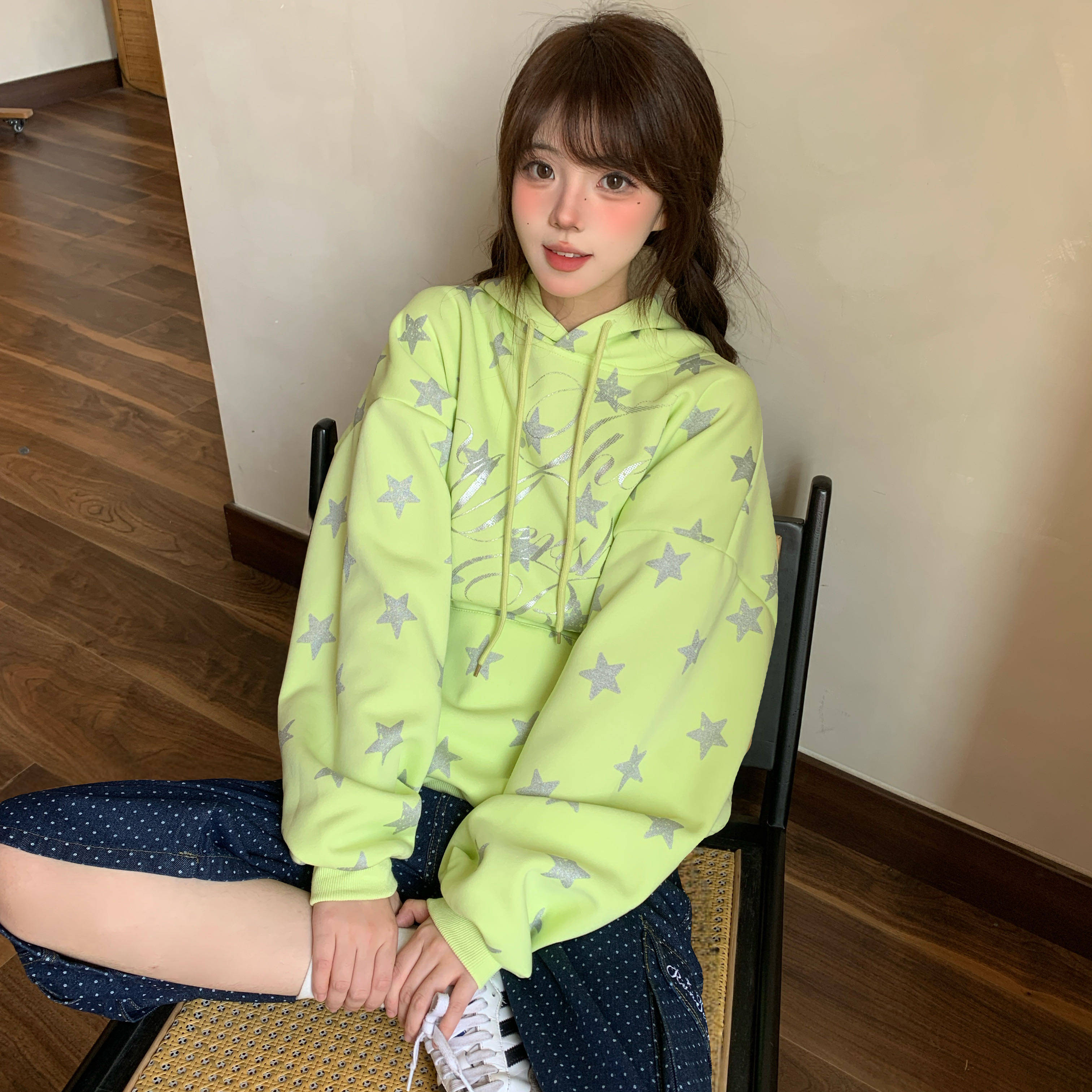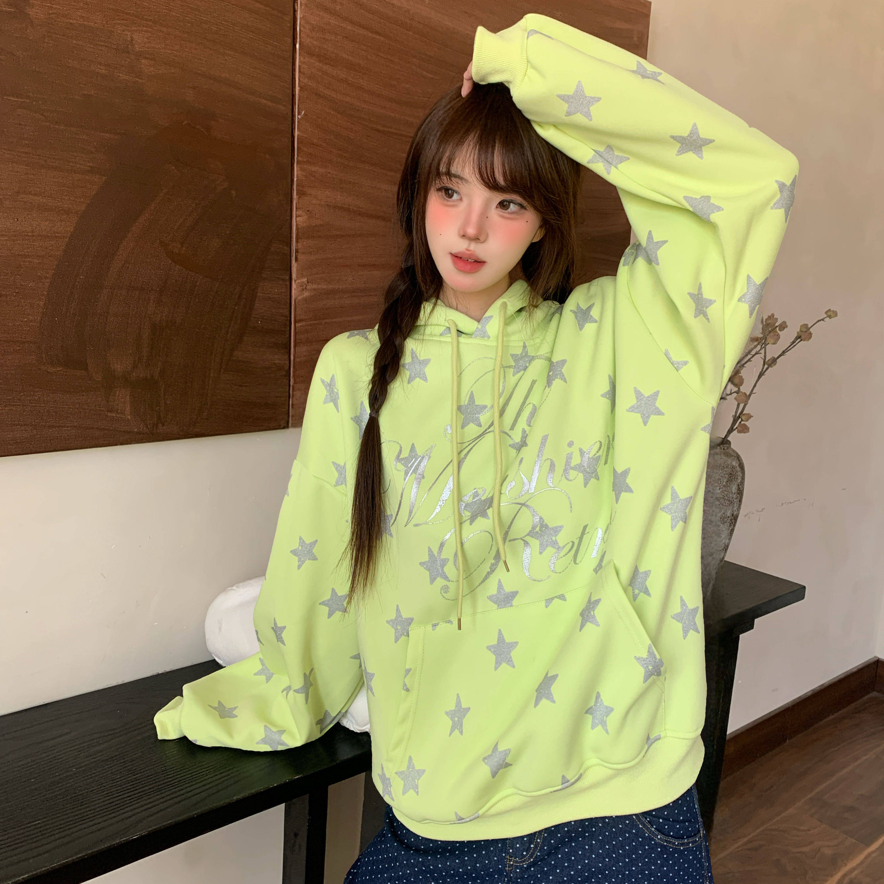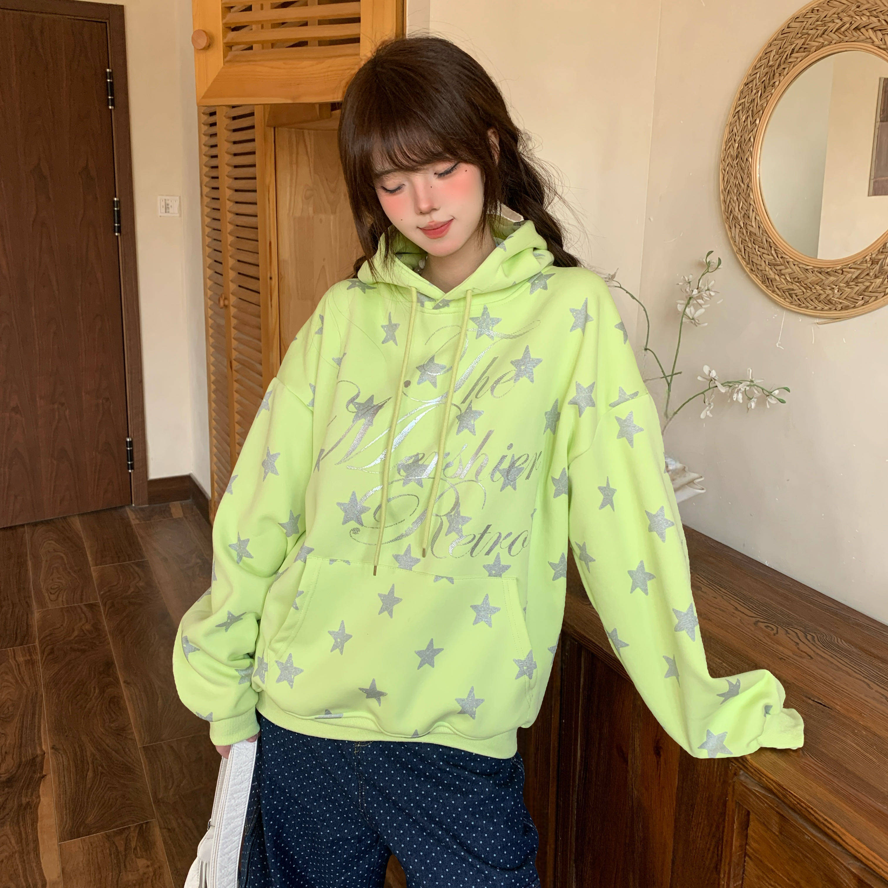 淘宝Amoeba,Amoeba韩系复古满印星星荧光绿连帽卫衣女春季新款宽松设计感帽衫