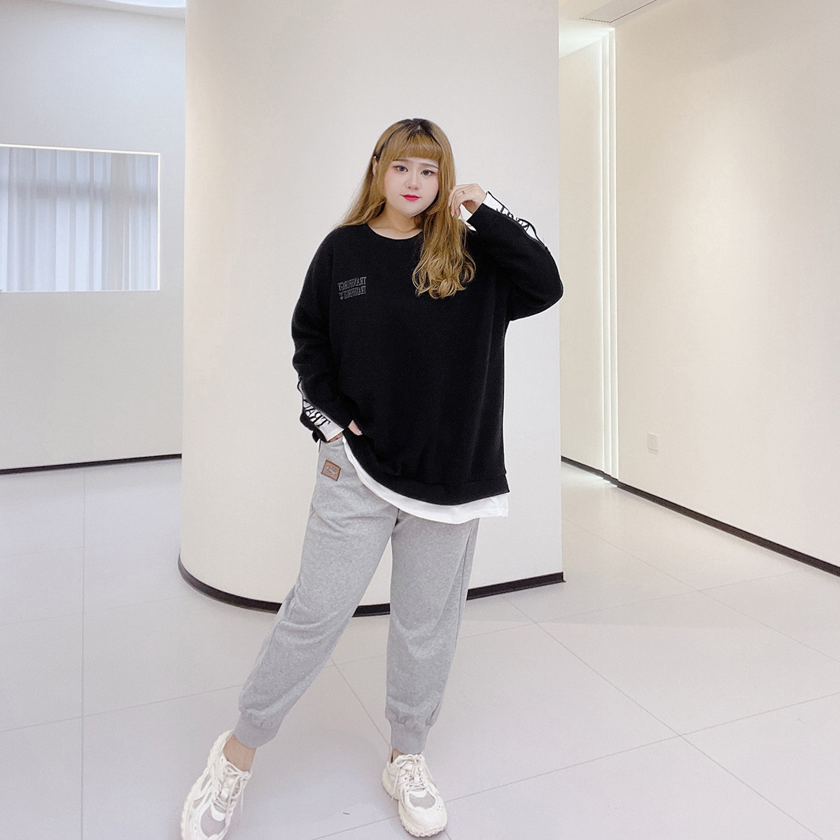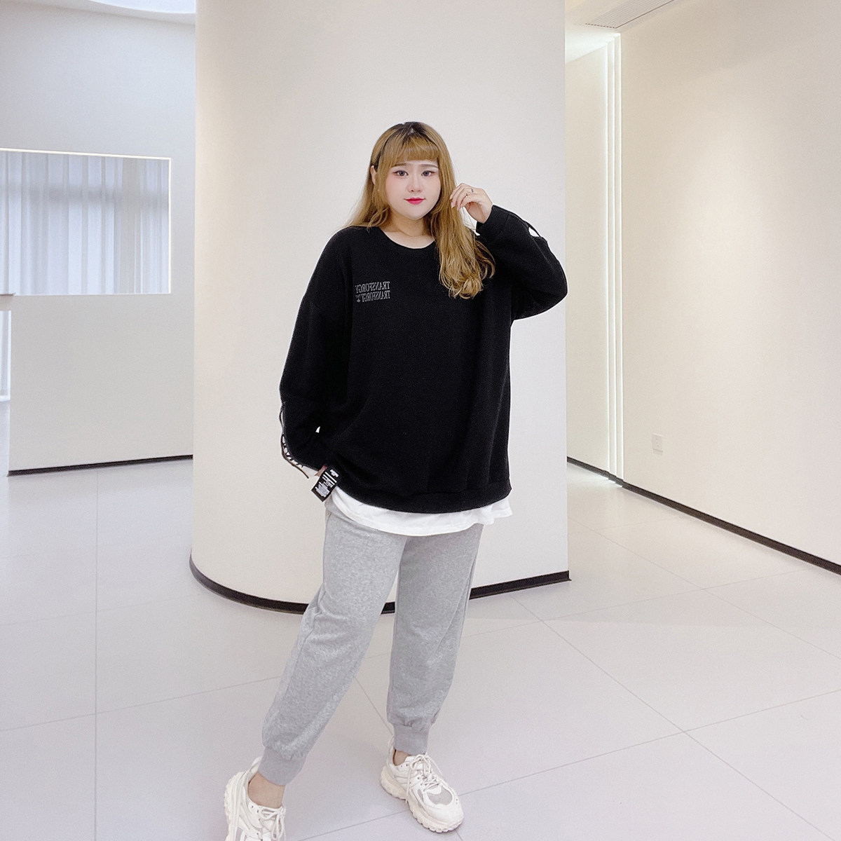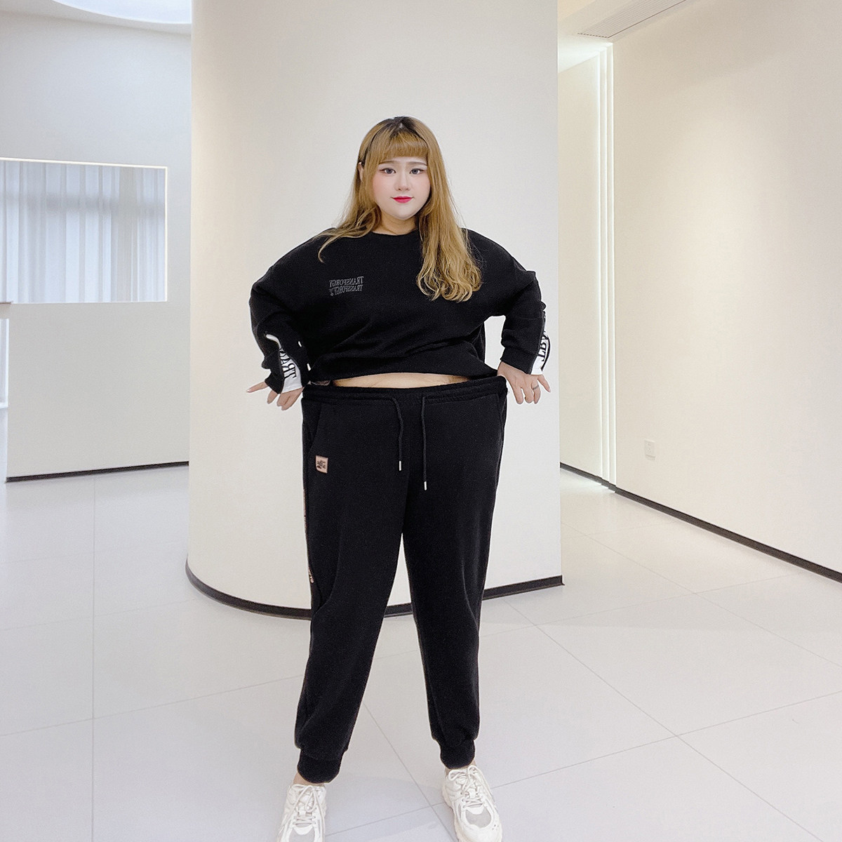 淘宝胖仙女莹莹大码女装,时髦纯色显瘦字母印花运动卫裤爆