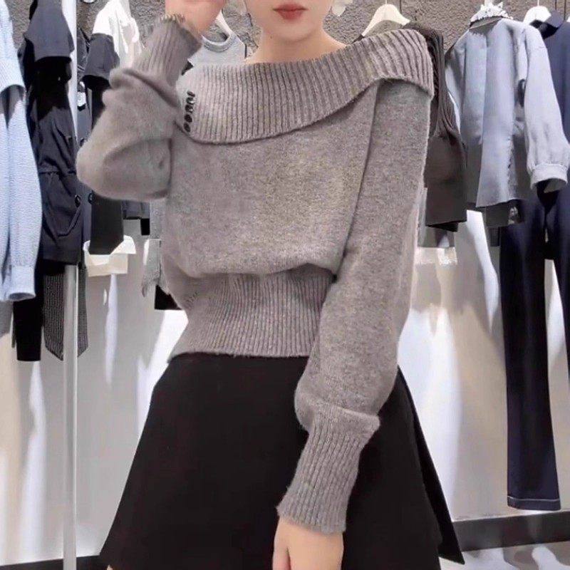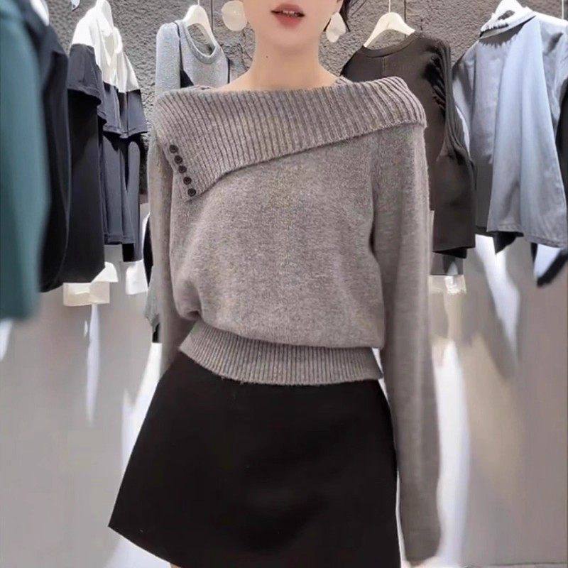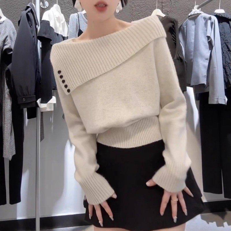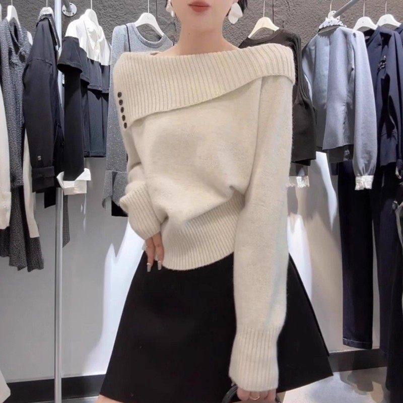 淘宝暖你一整天服装,大码一字肩翻领针织衫女2025秋冬季胖MM收腰显瘦套头毛衣洋气上衣