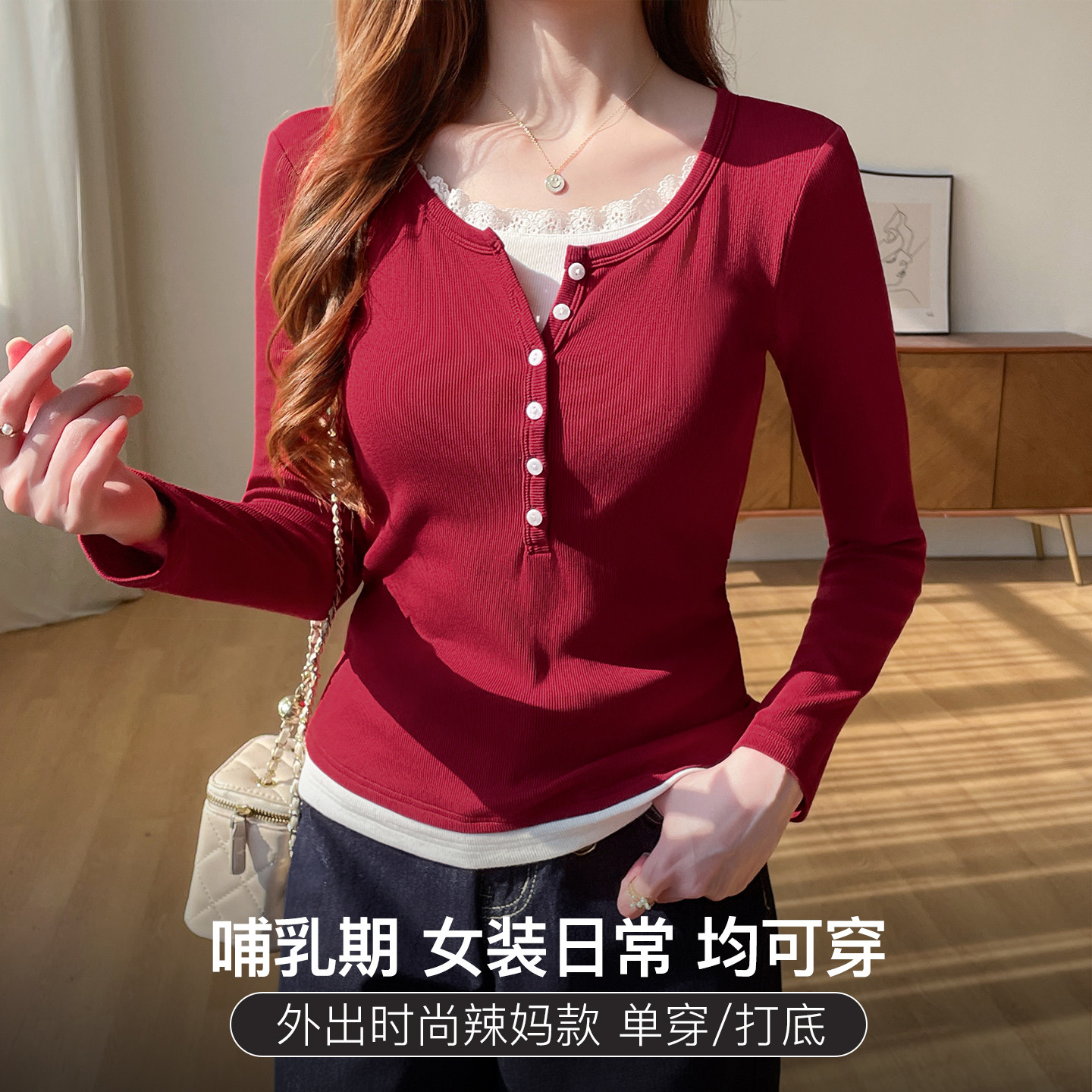 淘宝喜韵母婴品牌店,哺乳衣外出辣妈款显瘦T恤长袖假两件春秋季母乳喂奶上衣服打底衫