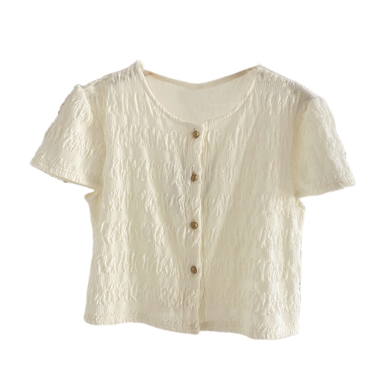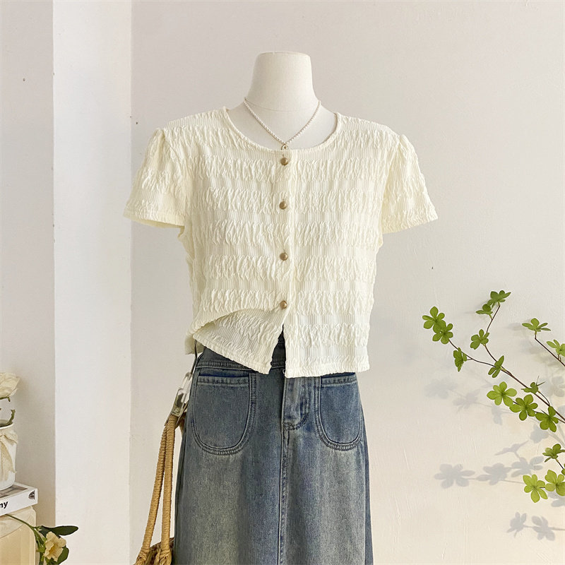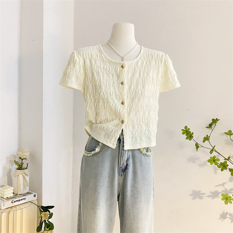 天猫莲妲旗舰店,短款气质排扣短袖褶皱圆领衬衫女,夏季薄款,小众气质,短款高腰,褶皱工艺