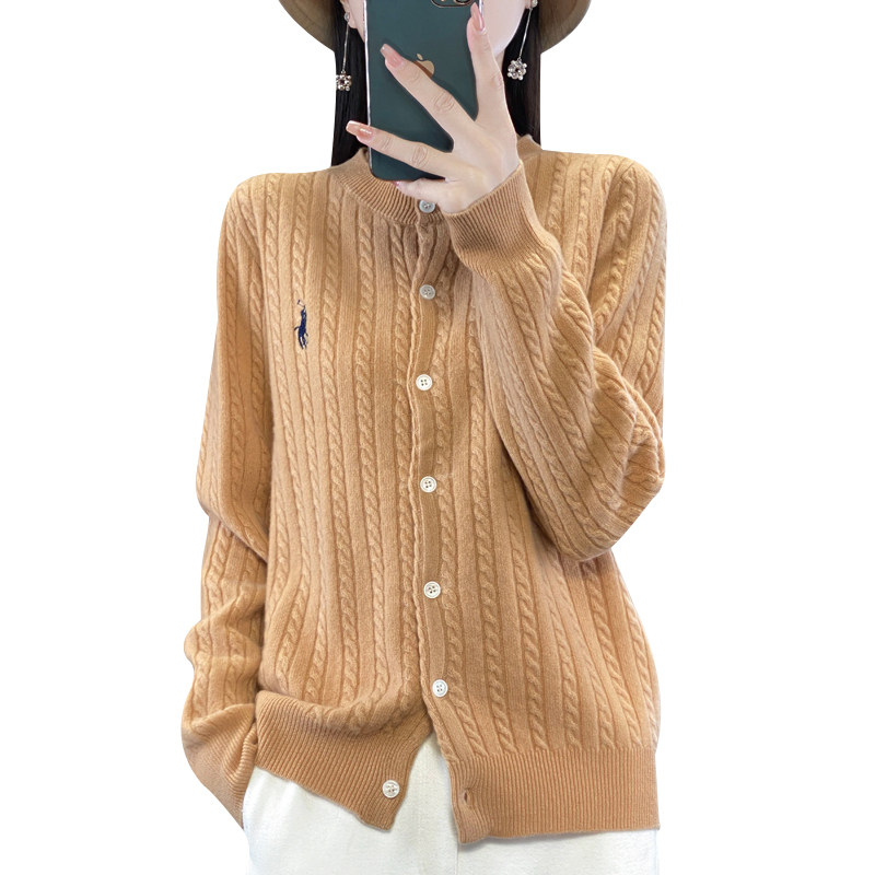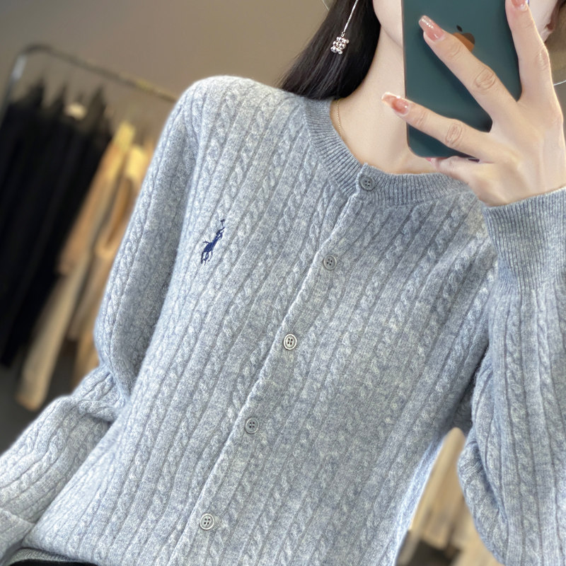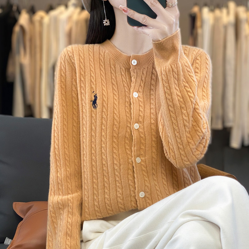 淘宝尹丽羊绒制品企业店,秋冬新款100%羊毛开衫女复古麻花毛衣针织外套小马刺绣羊绒短上衣