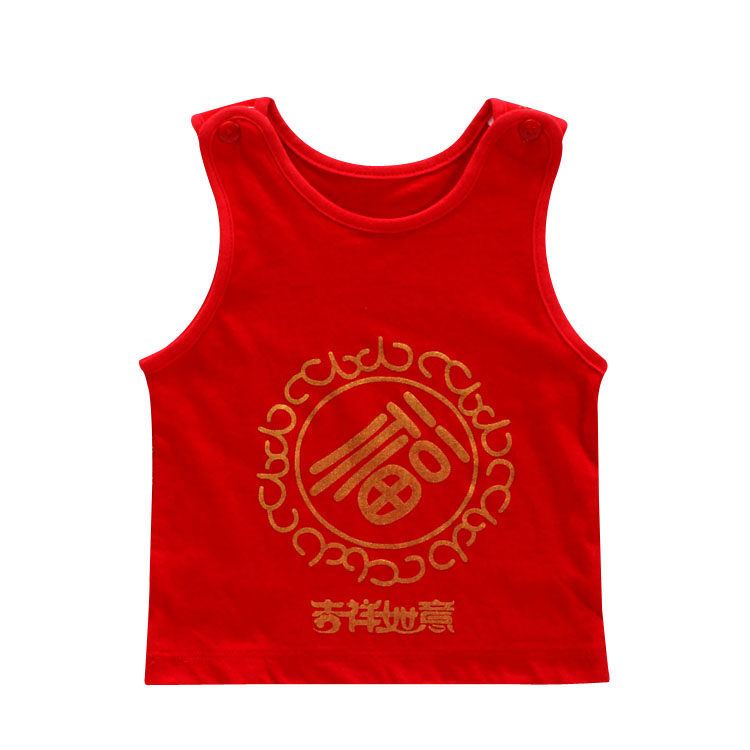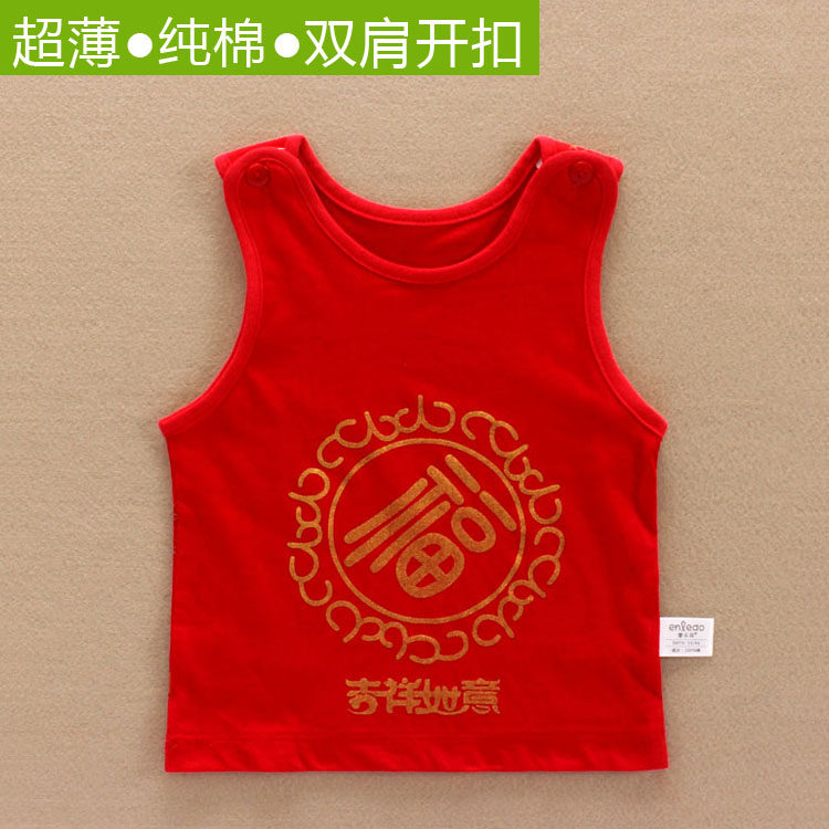 夏季婴乐岛宝宝大红色百天纯棉背心婴儿童超薄双肩开新年打底背心