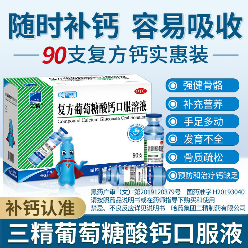 天猫阿里健康大药房,【自营】【三精】复方葡萄糖酸钙口服溶液5%5%*10ml*12支/盒液体钙助成长不易便秘好吸收,两种钙源 90支礼盒装