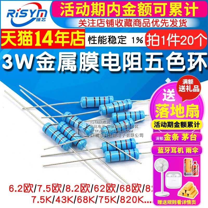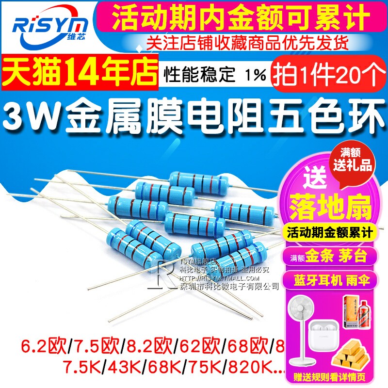 天猫risym旗舰店,3w金属膜电阻色环6.8k680欧,天猫14年老店 Risym维芯 高品质爆款