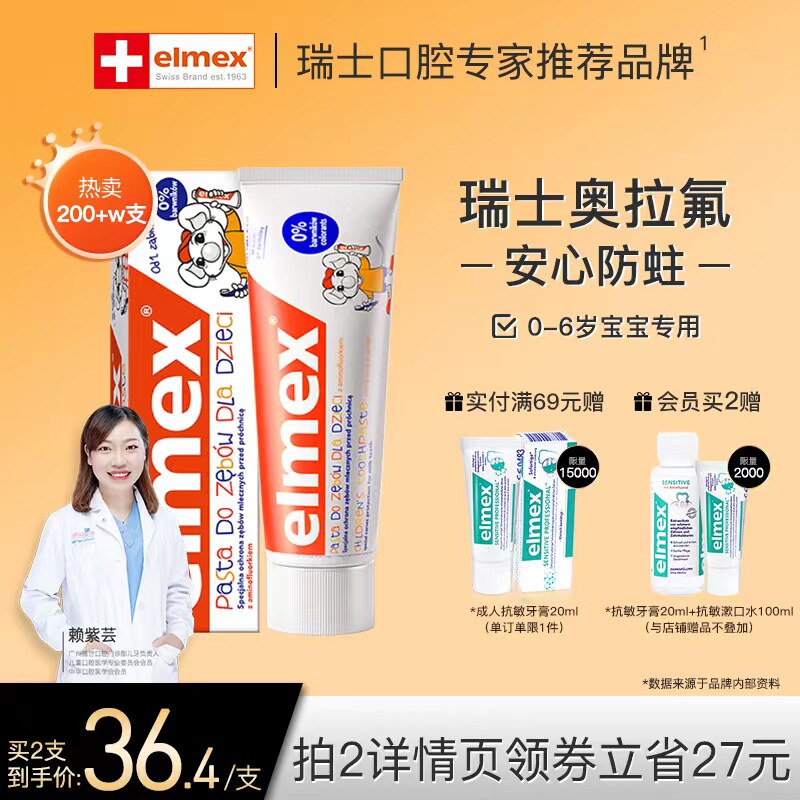 天猫elmex官方旗舰店,elmex艾美适0-6岁儿童牙膏含氟防蛀进口正品宝宝婴儿不辣嘴 61g,瑞士奥拉氟 一刷包裹 全方位防蛀