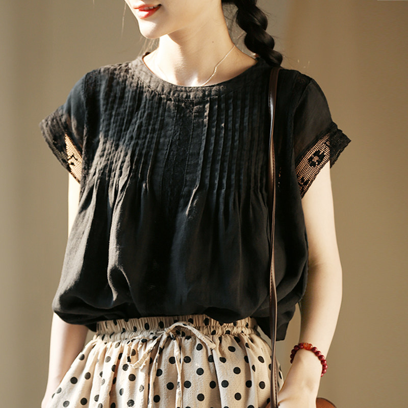 淘宝谷家出品 [每周二上新],谷家 轻薄苎麻甜美花边拼接无袖上衣 重工压褶黑色显瘦圆领小衫女