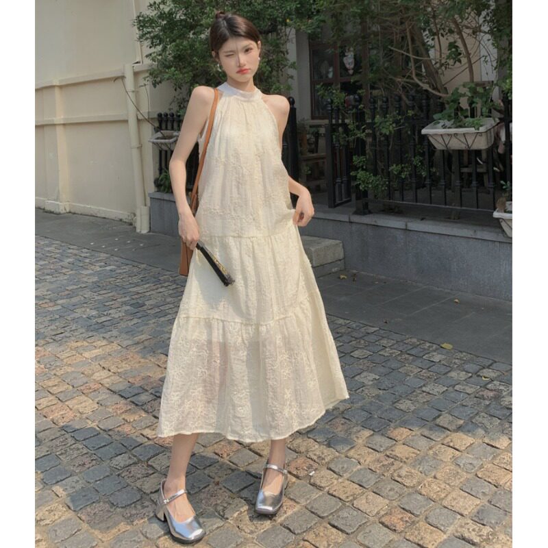 淘宝恋念,小个子法式复古蕾丝挂脖连衣裙夏季新款性感无袖露肩大摆长裙子女