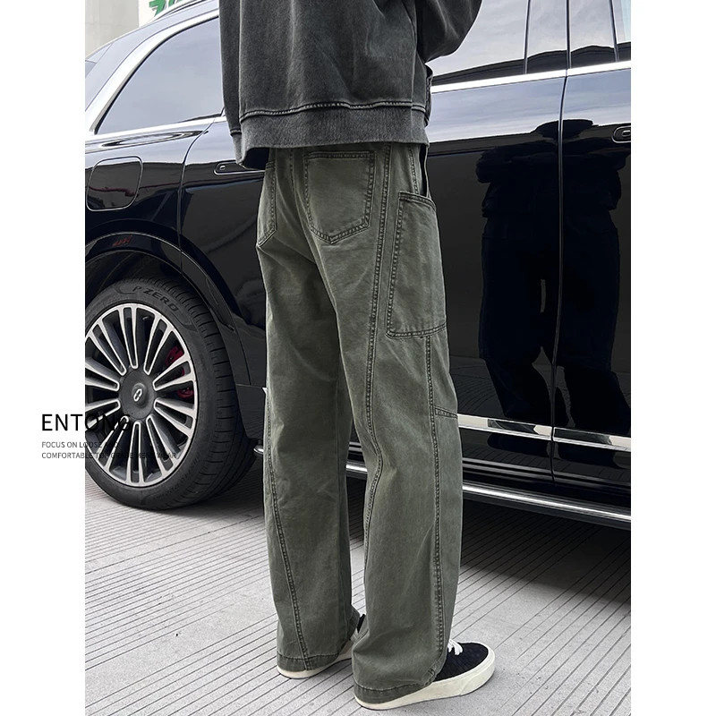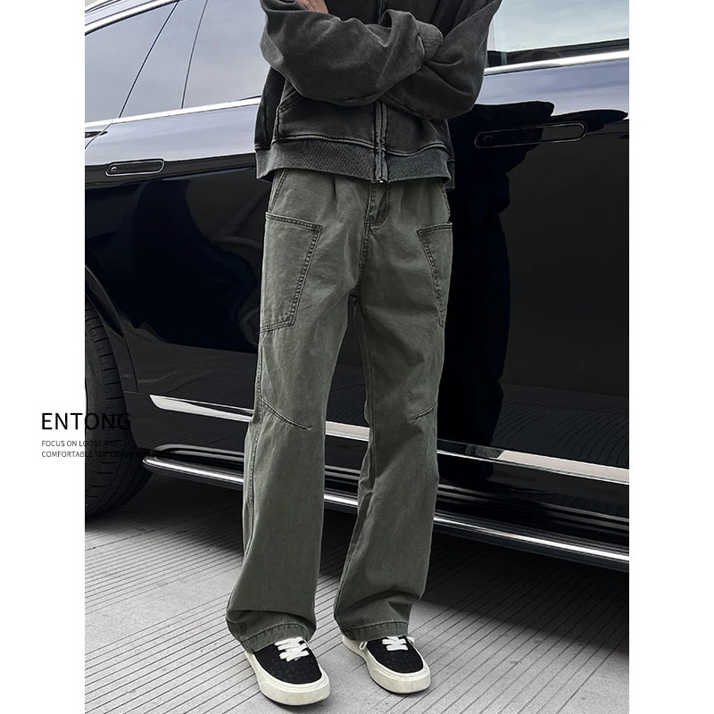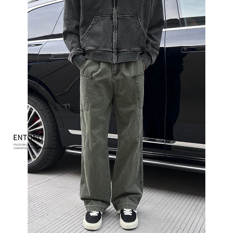 淘宝entong潮流男装,美式复古军绿色直筒工装裤