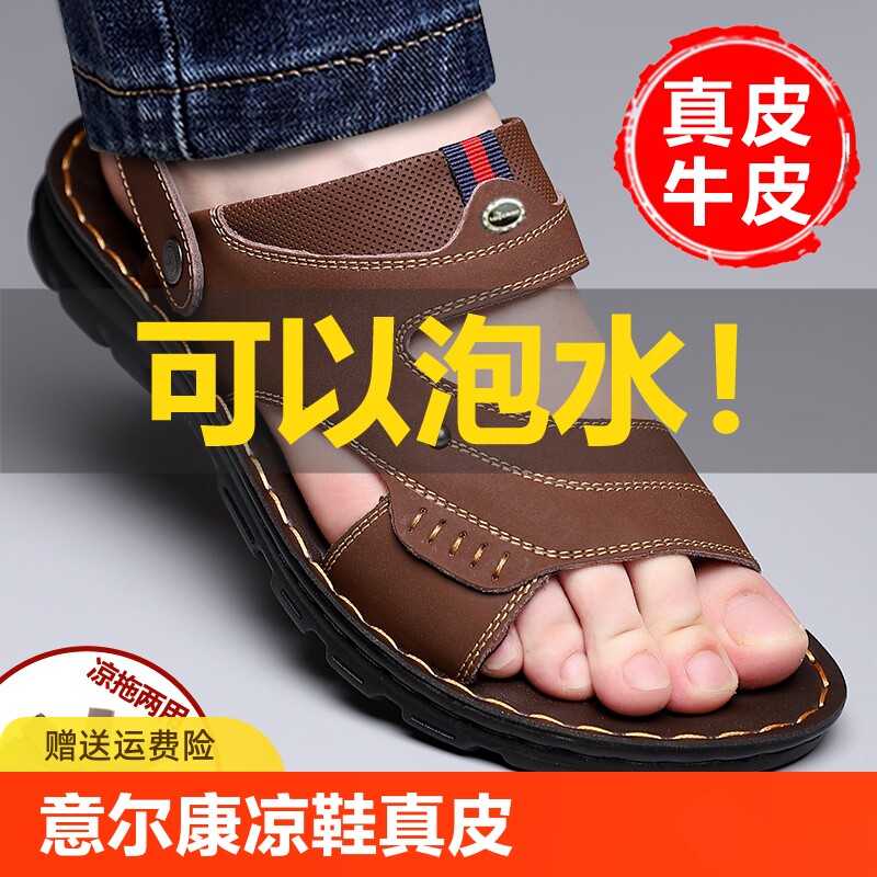 天猫天天特卖工厂店,意尔康凉鞋男真皮2024新款夏季软底防滑沙滩鞋外穿两用中老年爸爸