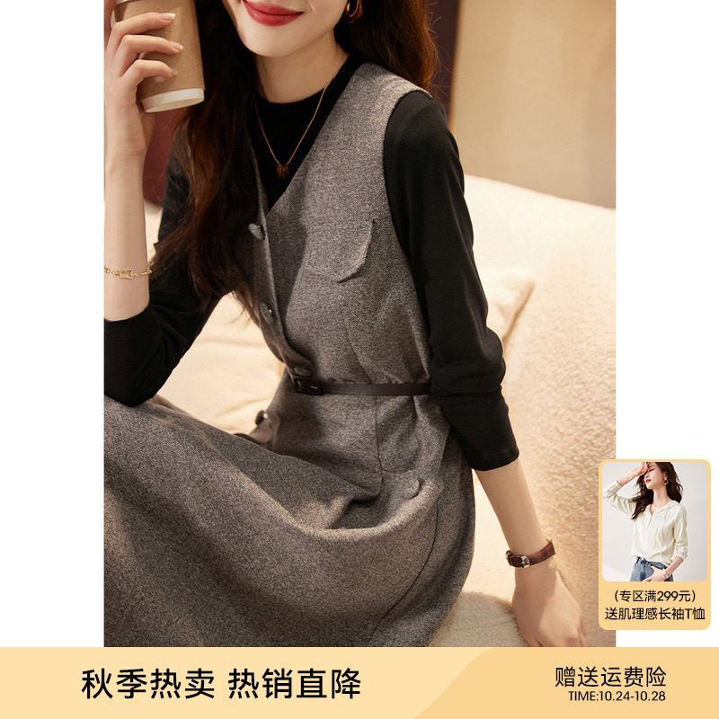 沫晗依美觅见系列大码女装2023冬新款简约气质百搭收腰马夹裙套装