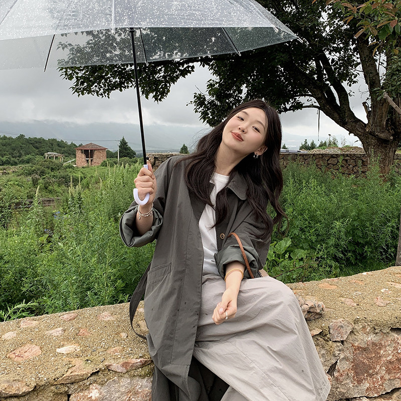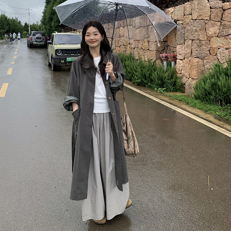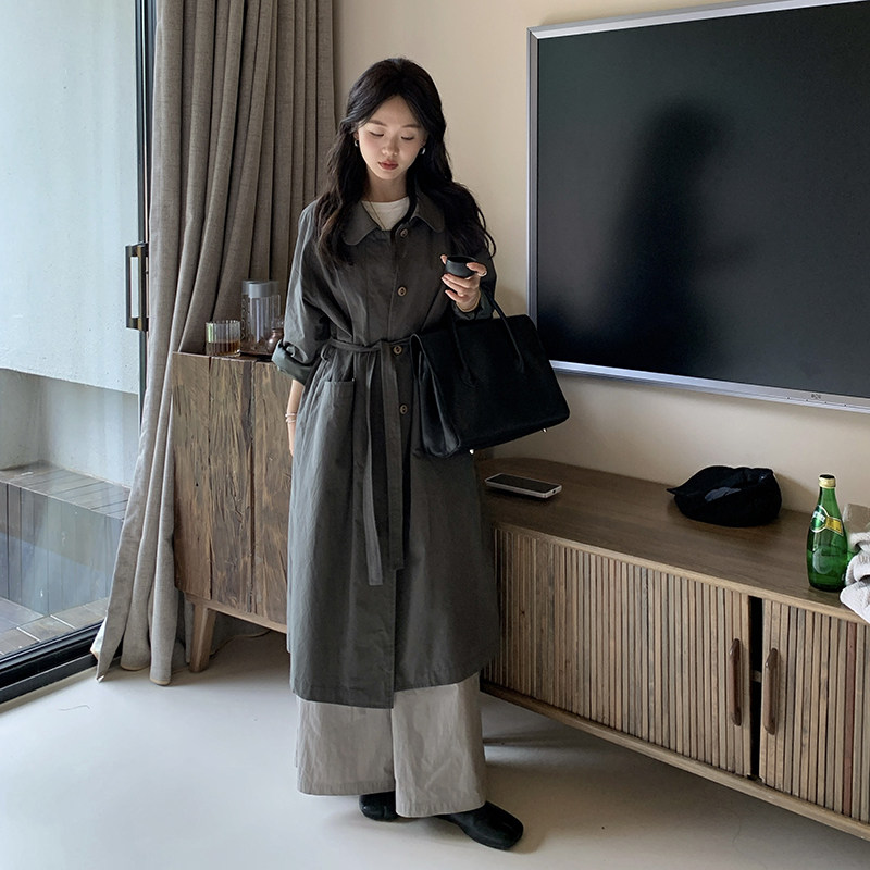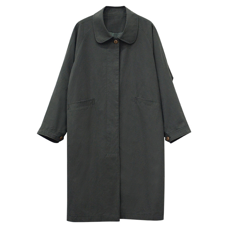 淘宝一三良品小个子,2024早秋宽松廓形暗绿长款风衣女