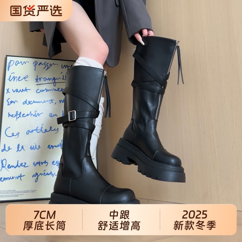 天猫1688官方工厂,7CM厚底长筒靴女英伦风骑士靴2025新款冬季美机车长靴子棕色黑色
