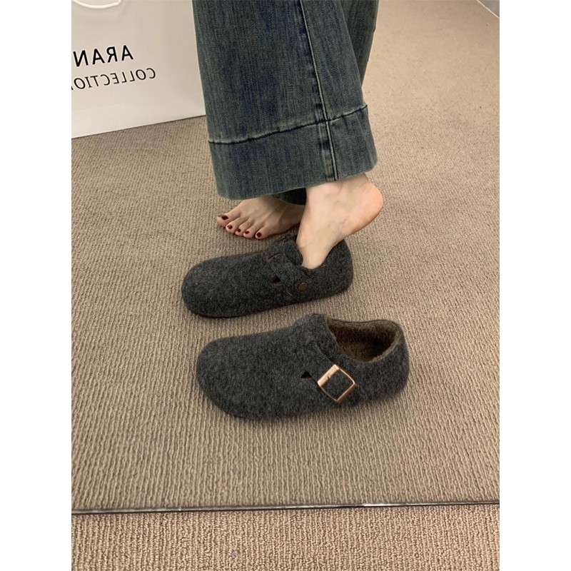 天猫淘工厂美妆直营,毛毡加绒勃肯鞋女2025秋冬新款一脚蹬保暖棉鞋毛呢乐福鞋灰色毛绒