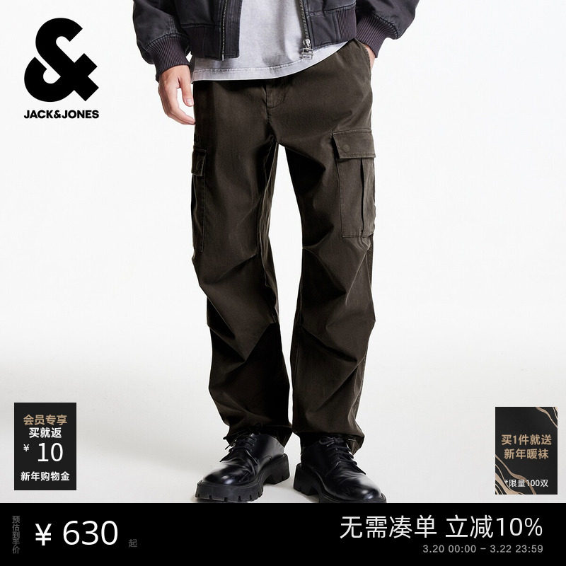 天猫JackJones官方旗舰店,杰克琼斯男装春季新款松紧舒适多口袋休闲阔腿直筒工装裤长裤子,宽松直筒裤裤型,松紧纽扣腰头,拉链门襟
