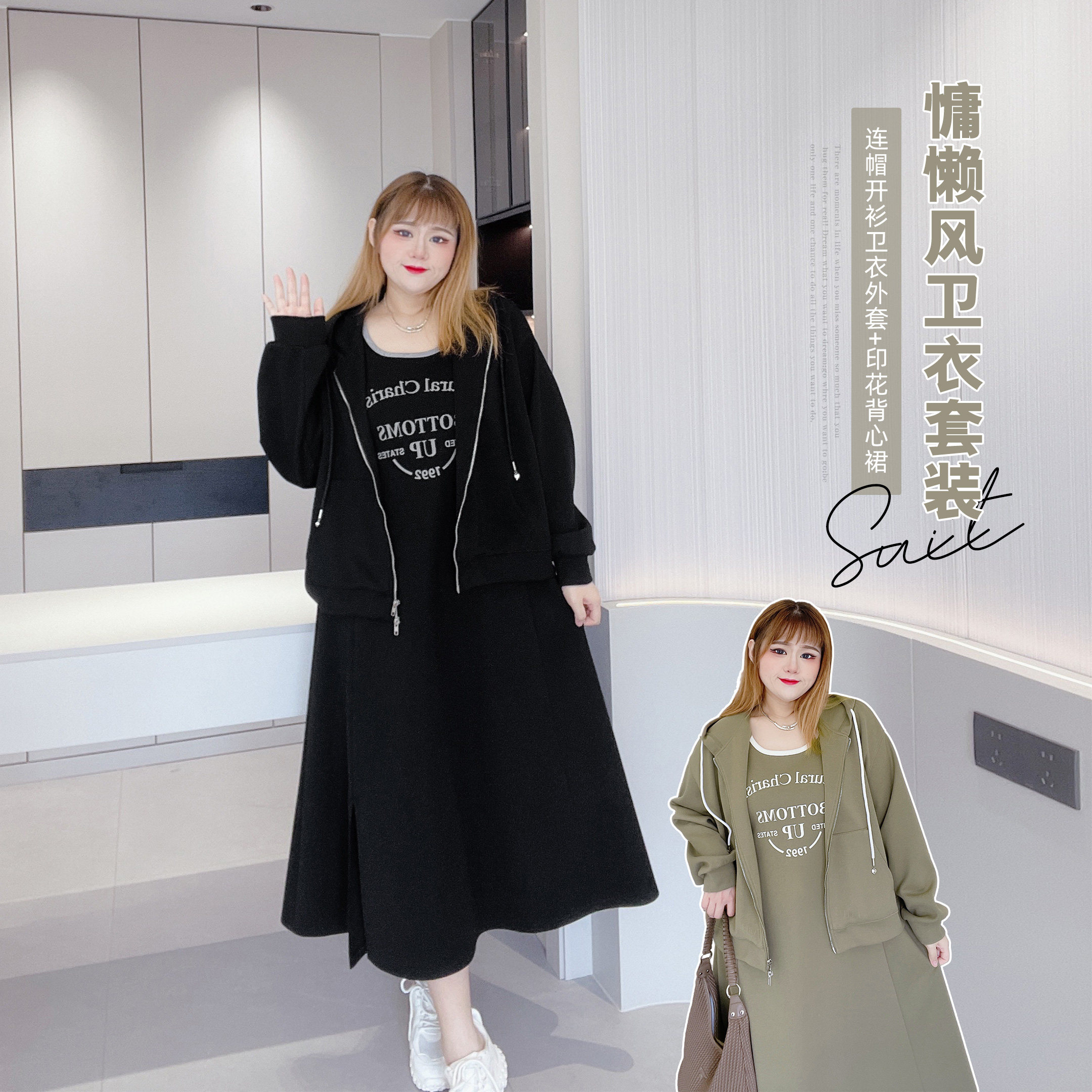 2023新款胖莹莹大码女装秋冬胖MM休闲吊带裙卫衣套装连衣裙时尚潮