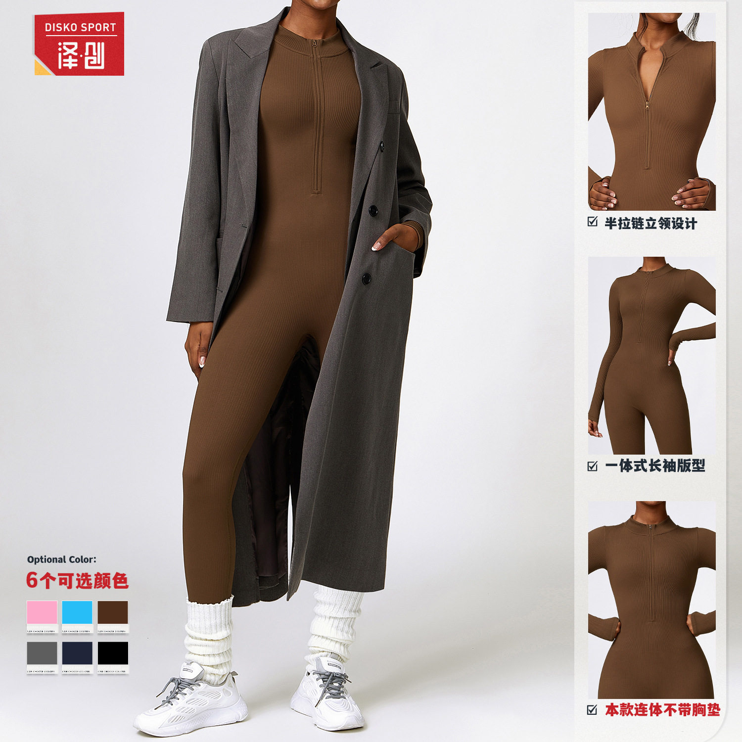 泽创欧美秋冬紧身长袖瑜伽连体服立领拉链收腹高强度运动健身服女