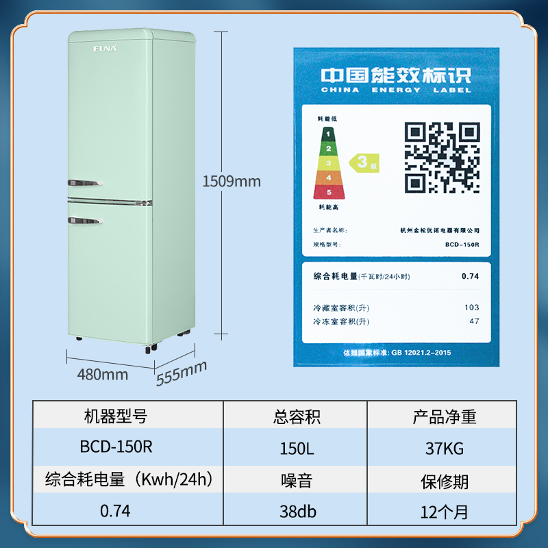 天猫EUNA云小象专卖店,euna /优诺bcd-150r复古小型冰箱,彩色复古 节能静音 公寓优选 赠品三选一