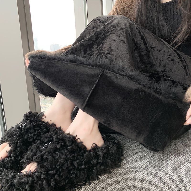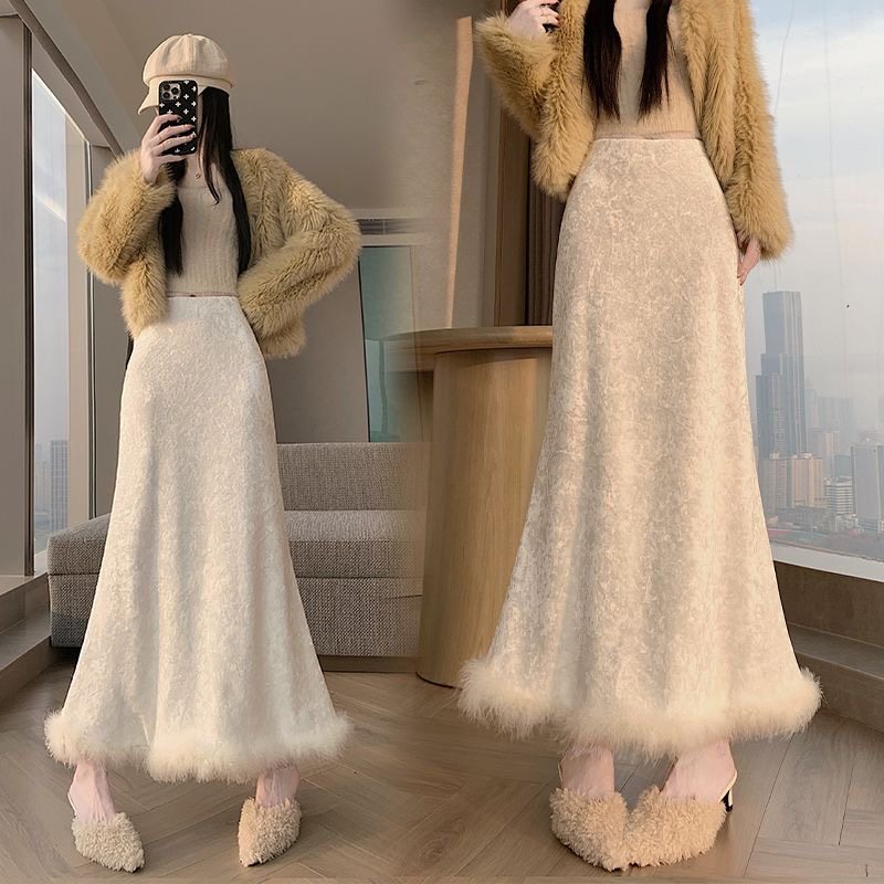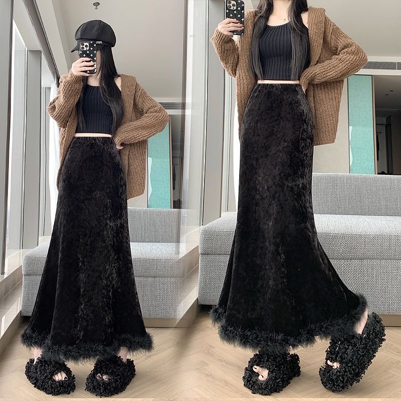 淘宝CaRRie女装供应链,丝绒包臀半身裙女秋冬2025新款黑色显瘦加绒下摆毛毛开叉A字裙子