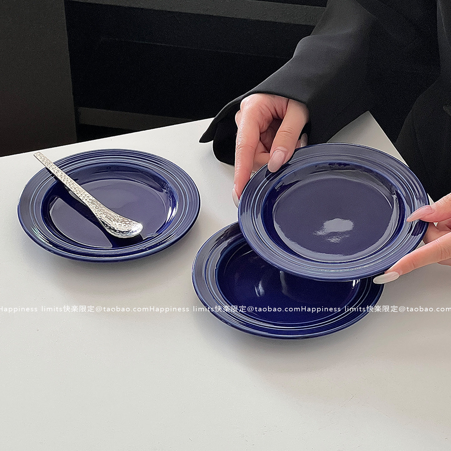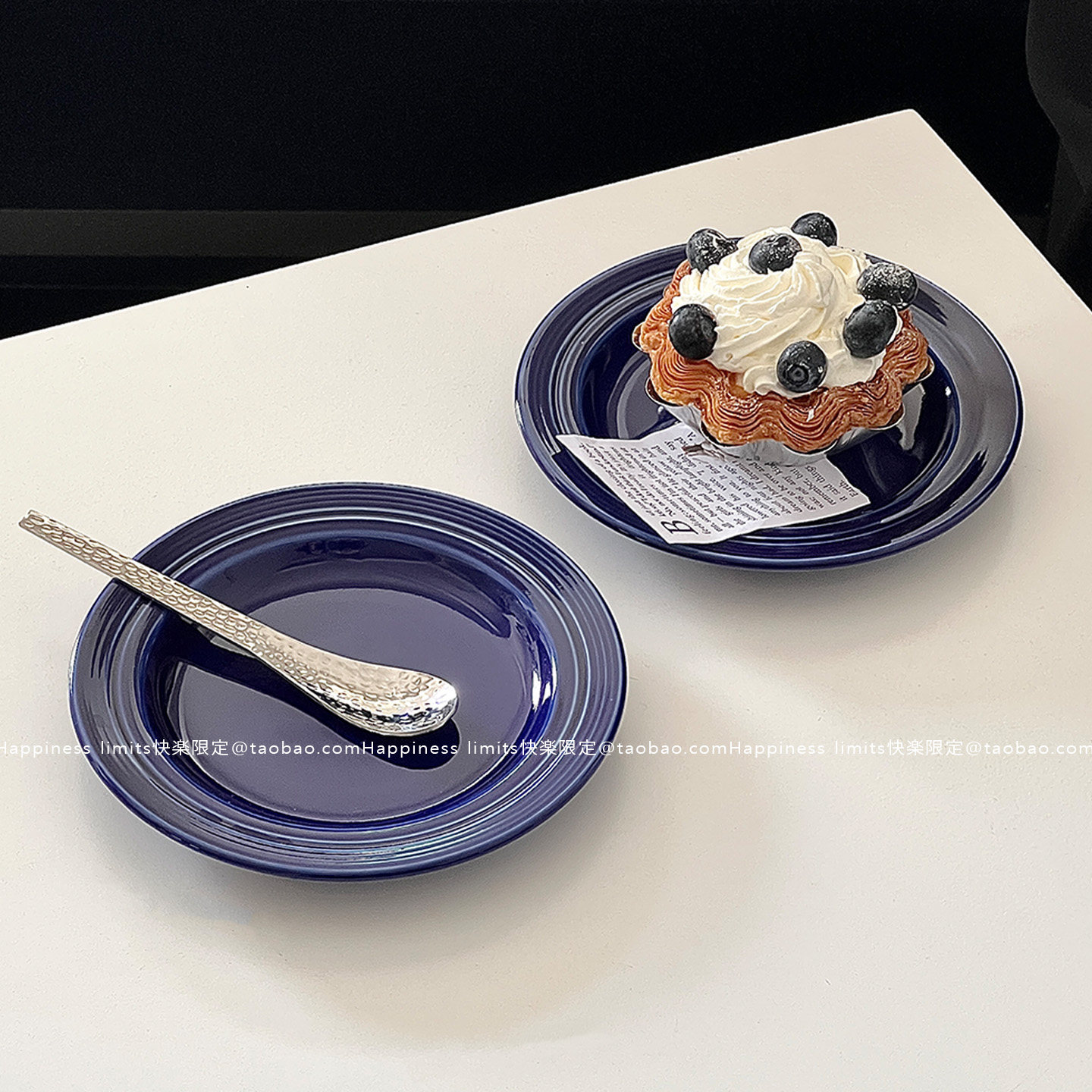淘宝Happiness limits快楽限定,INS博主款韩式克莱因蓝色圆形甜品盘陶瓷小碟子拍照点心牛排盘子