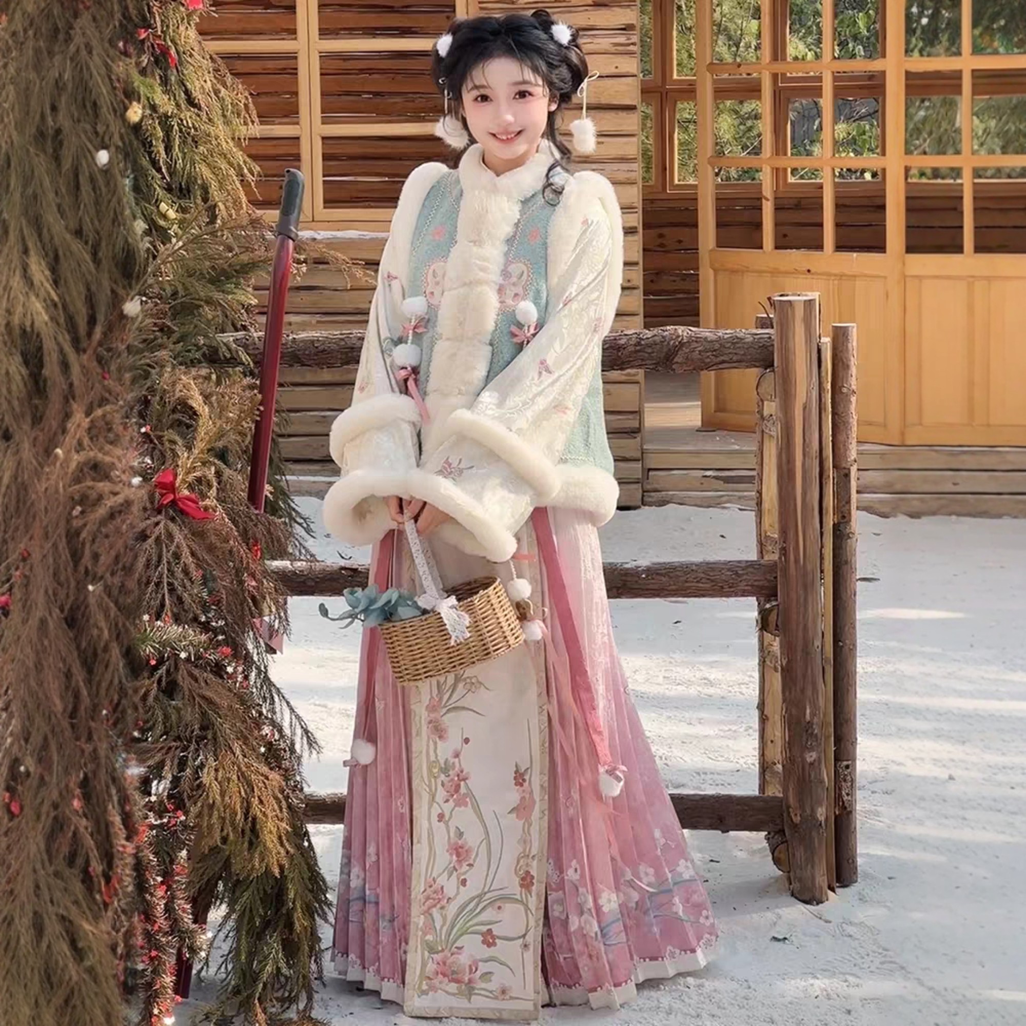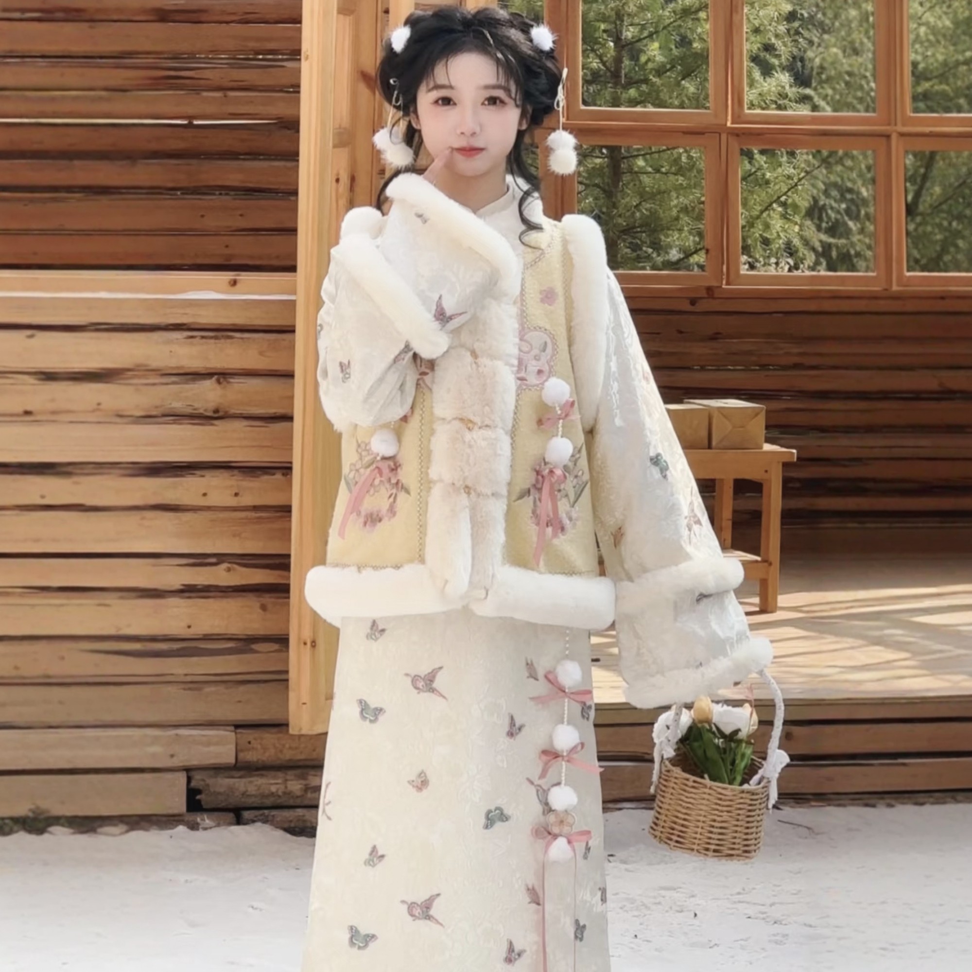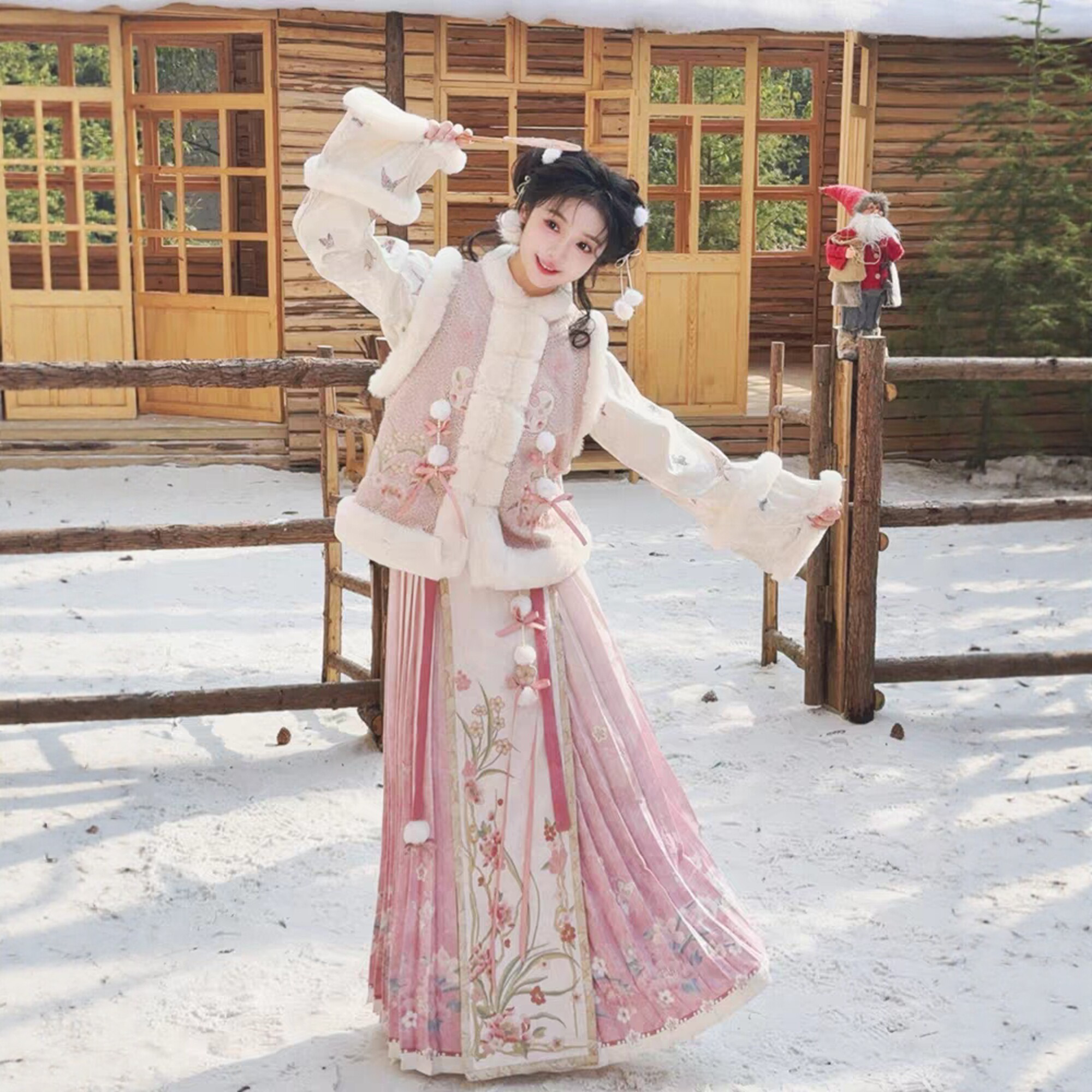 淘宝茶屿汉服,原创汉服女【雪绒绒】明制加绒加厚马甲立领衫套装黄粉蓝色冬季款