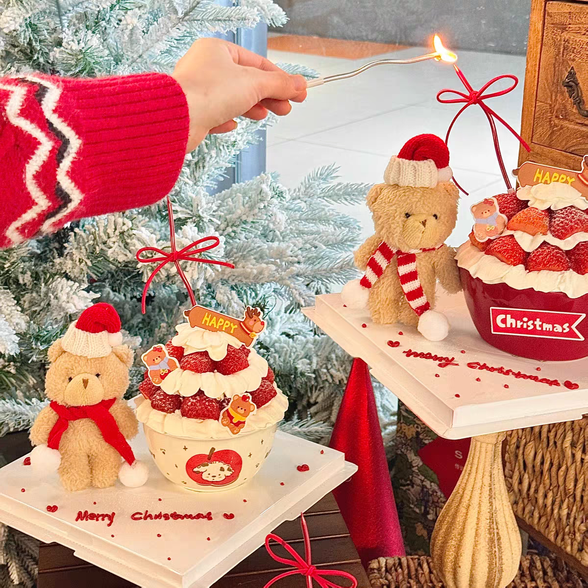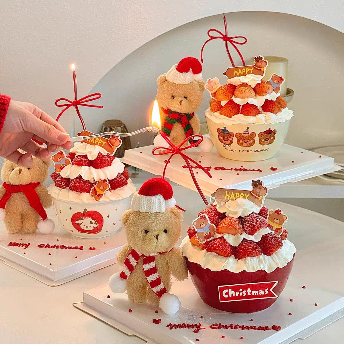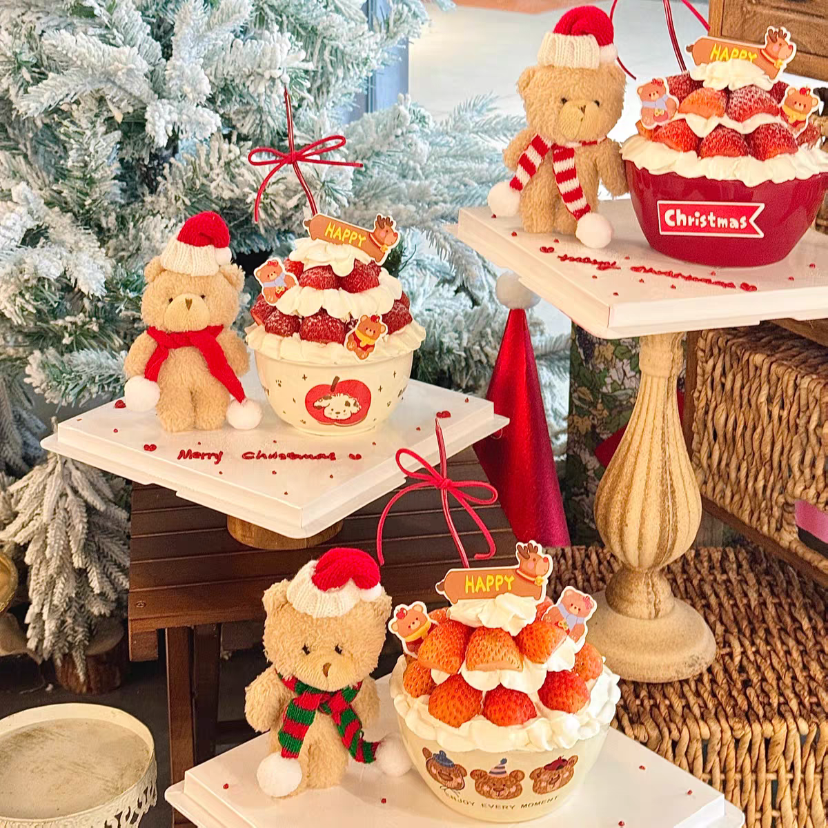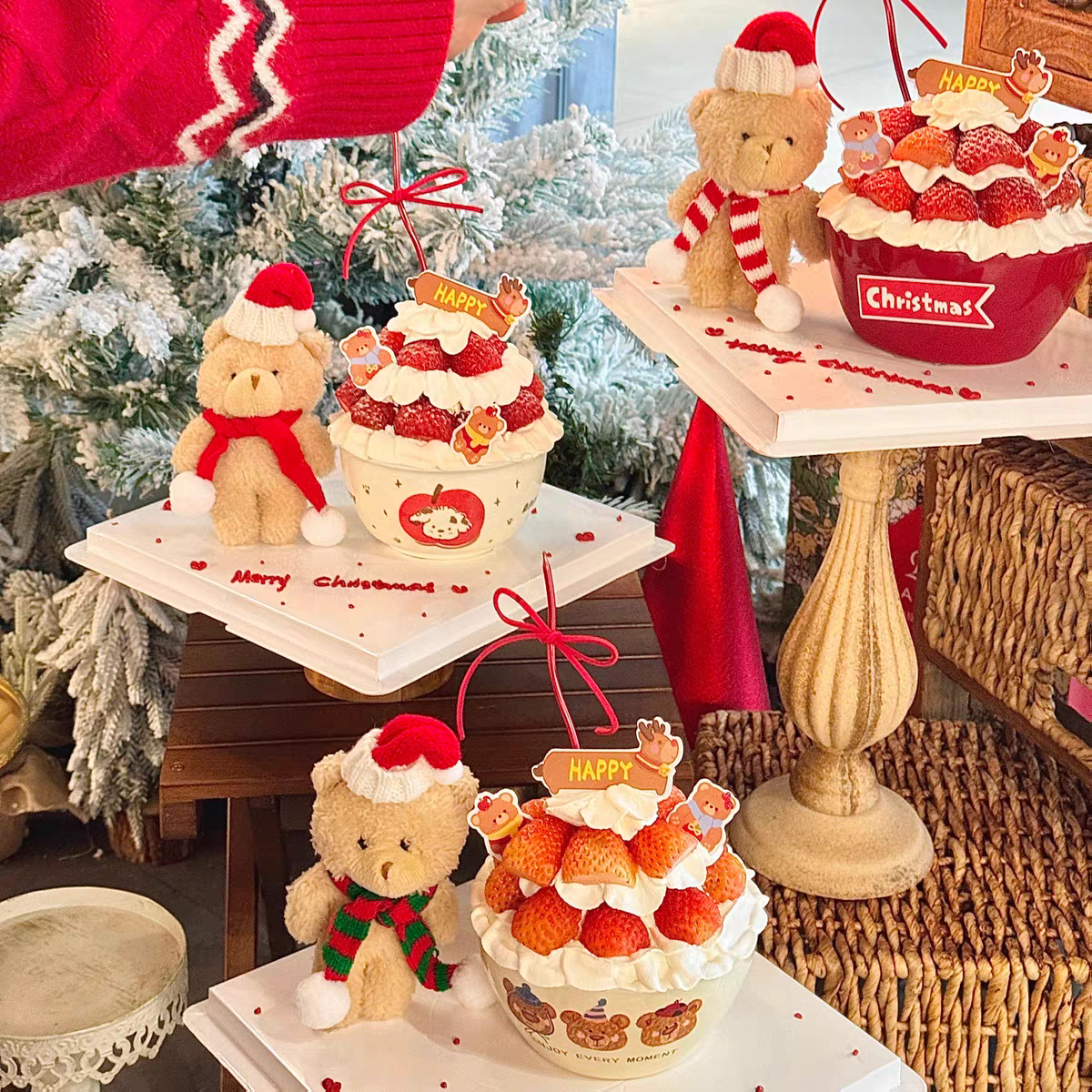 淘宝果果酱烘焙坊,2026圣诞节小熊草莓碗陶瓷碗甜品烘焙装扮围巾小熊蛋糕装饰摆件
