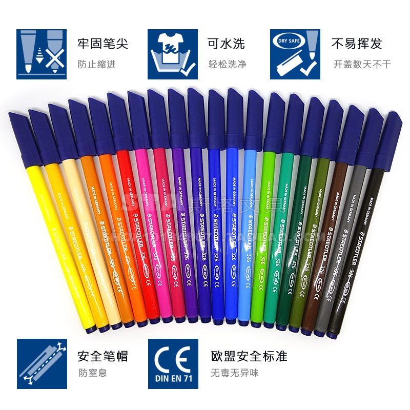 淘宝STA斯塔文具,德国原产staedtler 326食品级颜料,使用可食用颜料,安全无毒。 ◆防挥发,不盖笔帽墨水可以保持很长时间 ◆安全笔帽,笔帽内含透气孔,幼儿误食不会引起窒息 ◆墨水颜色鲜艳,不退色